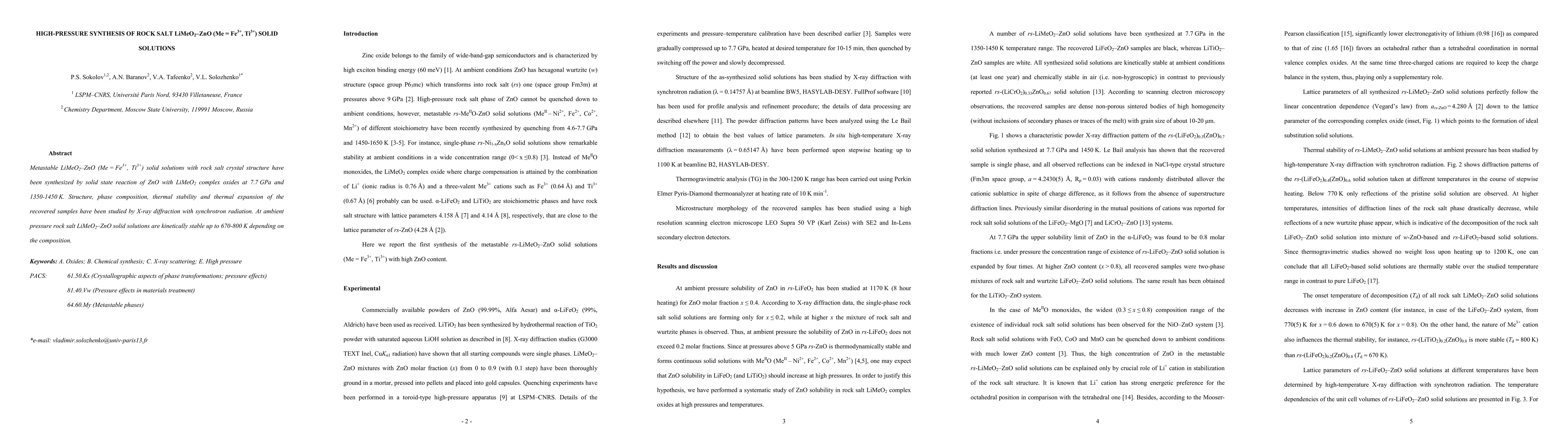 This paper reports the high-pressure synthesis of metastable rock salt LiMeO2-ZnO (Me = Fe3+, Ti3+) solid solutions via solid-state reactions at 7.7 GPa and 1350-1450 K. The synthesized materials exhibit kinetic stability up to 670-800 K under ambient pressure, as determined by X-ray diffraction analysis.