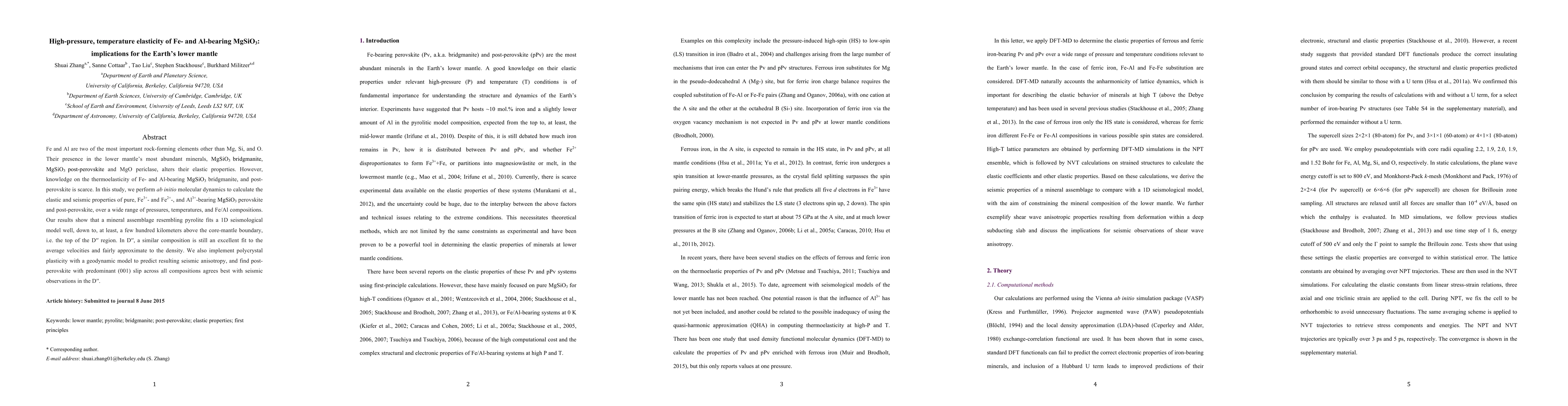 This study uses ab initio molecular dynamics to investigate the elasticity of Fe- and Al-bearing MgSiO_3 perovskite and post-perovskite under high pressure and temperature, revealing that a pyrolite-like mineral composition fits seismological models down to the D'' region of the lower mantle. The research also predicts seismic anisotropy from post-perovskite slip, showing good agreement with observed seismic data.
