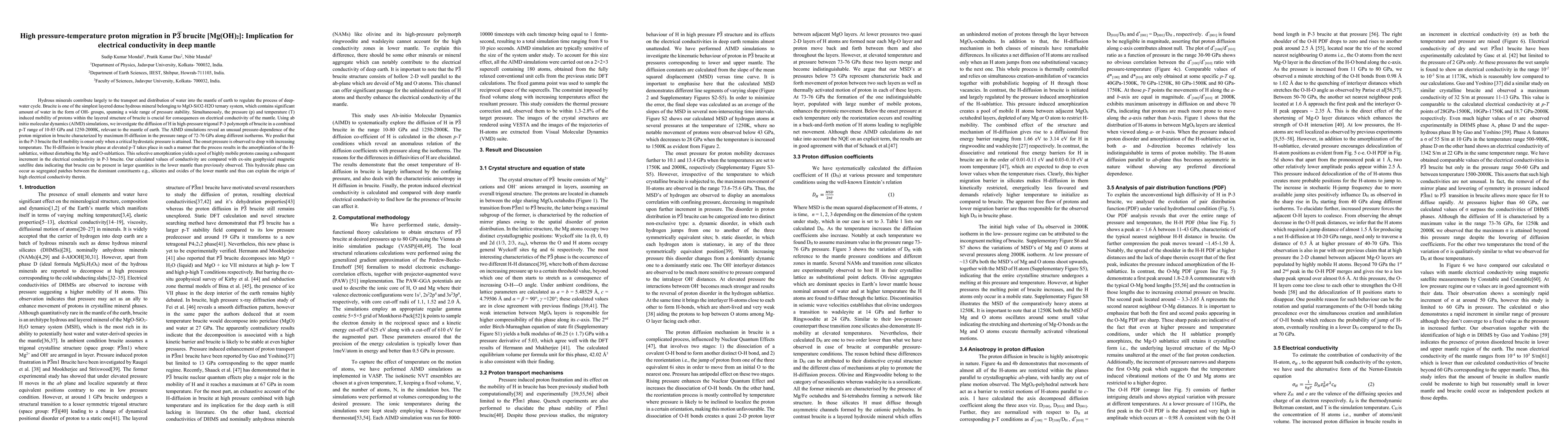 This study investigates the proton migration in P-3 brucite under high pressure and temperature conditions using ab initio molecular dynamics simulations. The findings reveal that proton mobility and electrical conductivity in brucite increase significantly at pressures between 72-76 GPa, suggesting brucite could be a major contributor to the high electrical conductivity observed in the lower mantle.