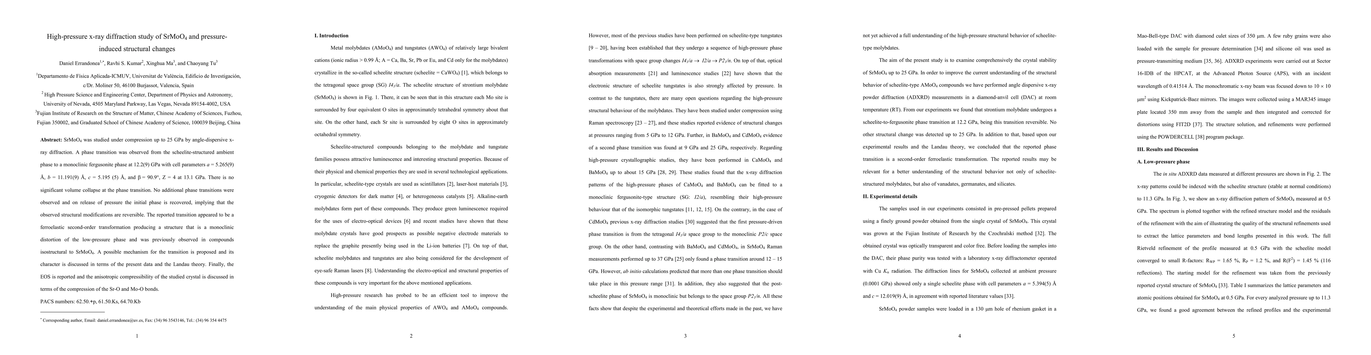SrMoO4 undergoes a phase transition from scheelite to monoclinic fergusonite structure at 12.2 GPa, with no significant volume change, and the transition is reversible. The transition is identified as a ferroelastic second-order transformation, and the anisotropic compressibility of the crystal is analyzed based on Sr-O and Mo-O bond compressions.