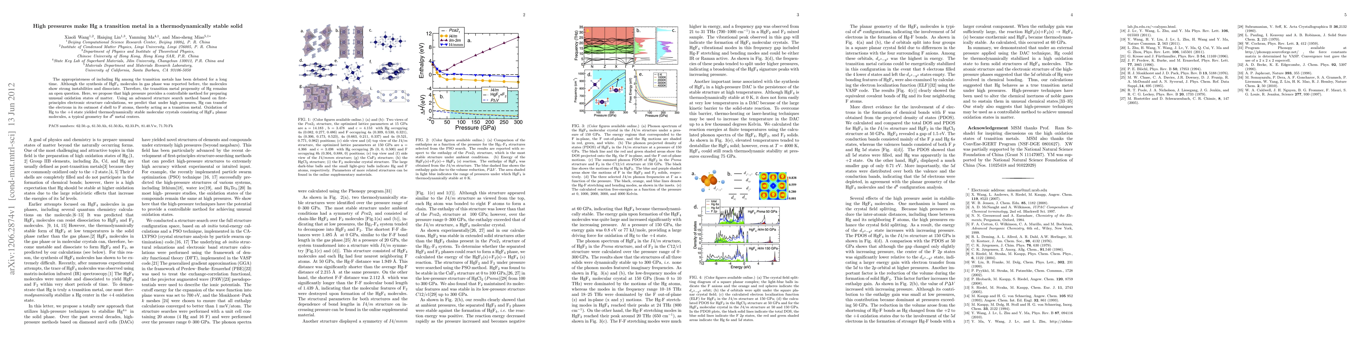 The appropriateness of including Hg among the transition metals has been debated for a long time. Although the synthesis of HgF$_{4}$ molecules in gas phase was reported before, the molecules show strong instabilities and dissociate. Therefore, the transition metal propensity of Hg remains an open question. Here, we propose that high pressure provides a controllable method for preparing unusual oxidation states of matter. Using an advanced structure search method based on first-principles electronic structure calculations, we predict that under high pressures, Hg can transfer the electrons in its outmost $d$ shell to F atoms, thereby acting as a transition metal. Oxidation of Hg to the +4 state yielded thermodynamically stable molecular crystals consisting of HgF$_{4}$ planar molecules, a typical geometry for $d^{8}$ metal centers.