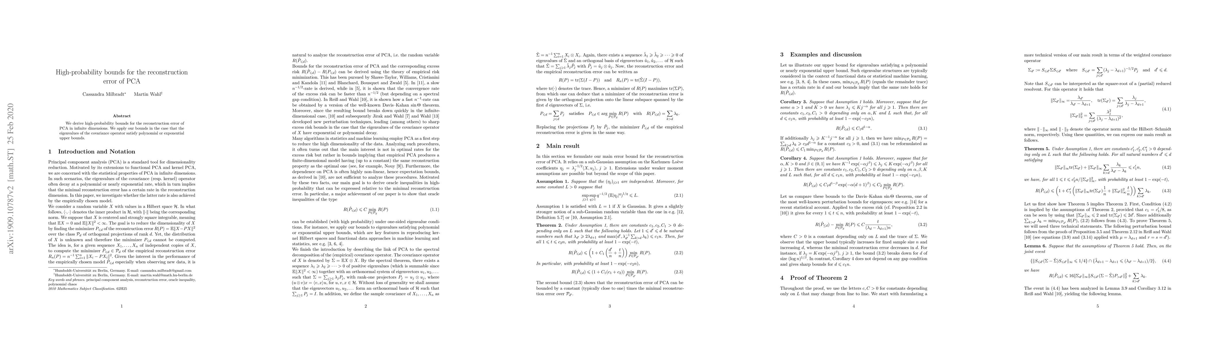 Summary: This paper establishes high-probability bounds for the reconstruction error in PCA within infinite dimensions, particularly when the covariance operator's eigenvalues exhibit polynomial or exponential decay. The findings provide a deeper understanding of PCA's performance under various eigenvalue conditions.