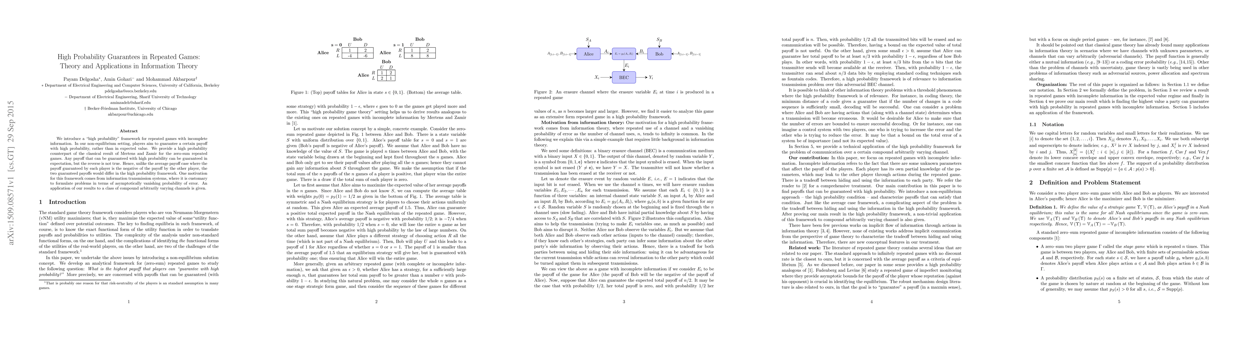 We introduce a "high probability" framework for repeated games with incomplete information. In our non-equilibrium setting, players aim to guarantee a certain payoff with high probability, rather than in expected value. We provide a high probability counterpart of the classical result of Mertens and Zamir for the zero-sum repeated games. Any payoff that can be guaranteed with high probability can be guaranteed in expectation, but the reverse is not true. Hence, unlike the average payoff case where the payoff guaranteed by each player is the negative of the payoff by the other player, the two guaranteed payoffs would differ in the high probability framework. One motivation for this framework comes from information transmission systems, where it is customary to formulate problems in terms of asymptotically vanishing probability of error. An application of our results to a class of compound arbitrarily varying channels is given.