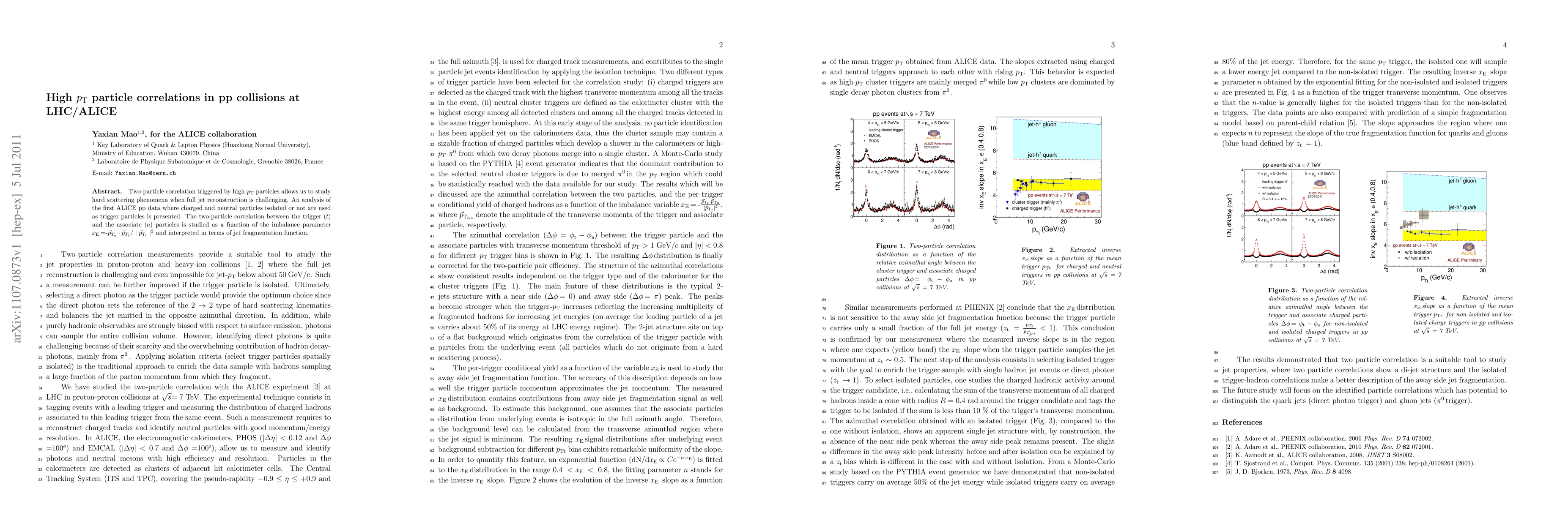 Two-particle correlation triggered by high-\pt{} particles allows us to study hard scattering phenomena when full jet reconstruction is challenging. An analysis of the first ALICE pp data where charged and neutral particles isolated or not are used as trigger particles is presented. The two-particle correlation between the trigger ($t$) and the associate ($a$) particles is studied as a function of the imbalance parameter \xe=-$\vec{p}_{T_{a}} \cdot \vec{p}_{T_{t}}/\mid \vec{p}_{T_{t}}\mid ^{2}$ and interpreted in terms of jet fragmentation function.