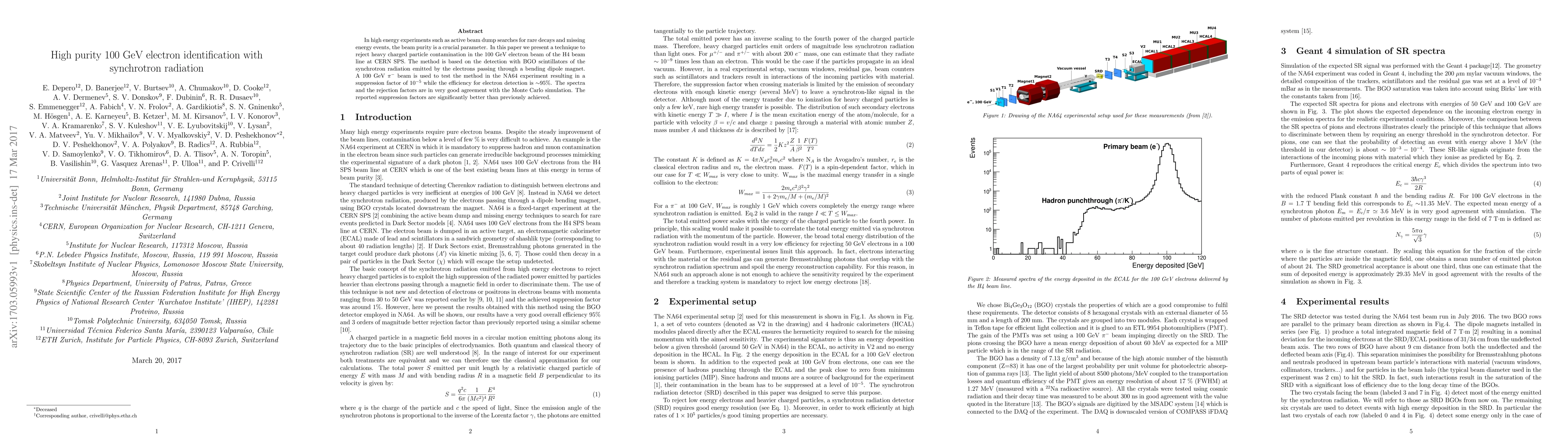 In high energy experiments such as active beam dump searches for rare decays and missing energy events, the beam purity is a crucial parameter. In this paper we present a technique to reject heavy charged particle contamination in the 100 GeV electron beam of the H4 beam line at CERN SPS. The method is based on the detection with BGO scintillators of the synchrotron radiation emitted by the electrons passing through a bending dipole magnet. A 100 GeV $\pi^-$ beam is used to test the method in the NA64 experiment resulting in a suppression factor of $10^{-5}$ while the efficiency for electron detection is $\sim$95%. The spectra and the rejection factors are in very good agreement with the Monte Carlo simulation. The reported suppression factors are significantly better than previously achieved.