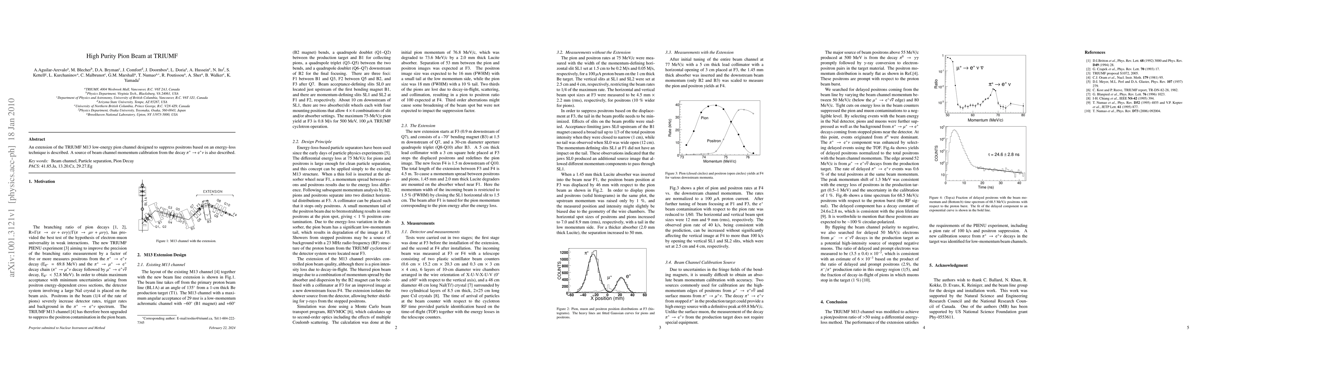 An extension of the TRIUMF M13 low-energy pion channel designed to suppress positrons based on an energy-loss technique is described. A source of beam channel momentum calibration from the decay pi+ --> e+ nu is also described.