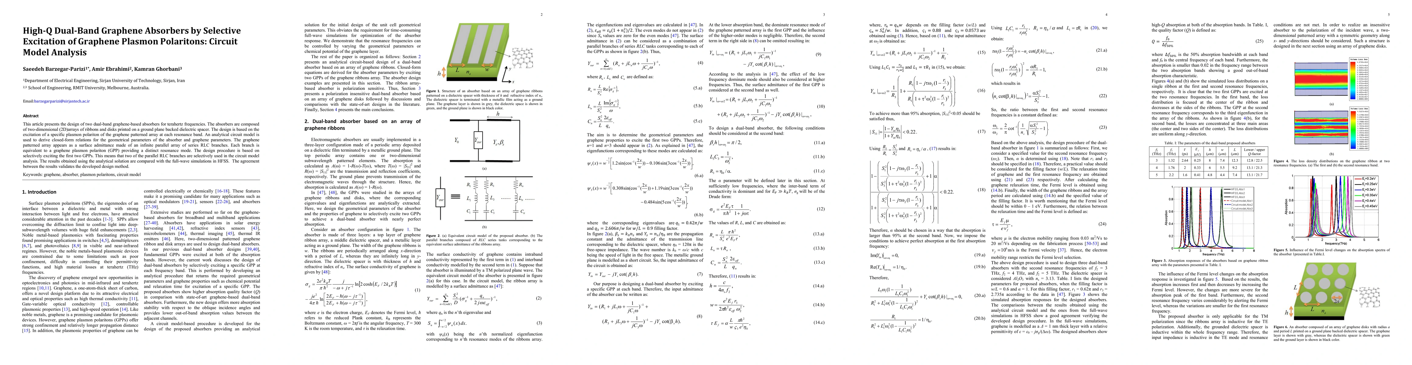 This paper designs dual-band graphene absorbers for terahertz frequencies using selective excitation of graphene plasmon polaritons. The analytical circuit model accurately predicts the geometrical parameters, validated by full-wave simulations.
