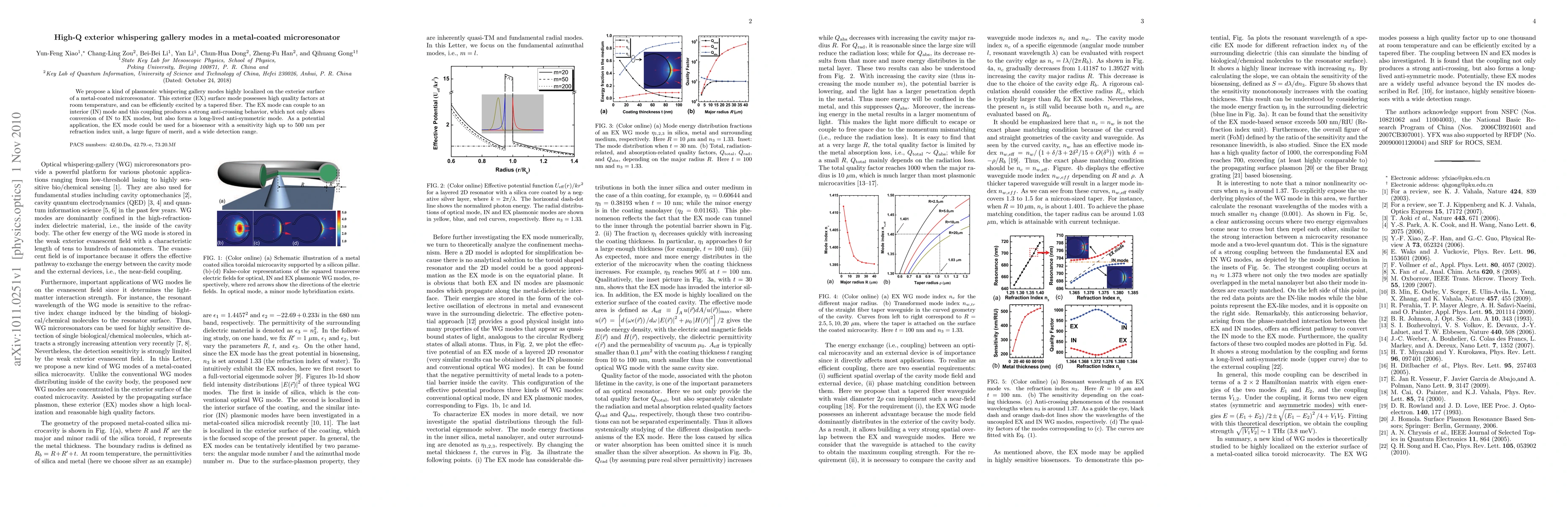 This paper proposes highly localized plasmonic whispering gallery modes on a metal-coated microresonator's exterior surface, exhibiting high quality factors and strong anti-crossing behavior when coupled to interior modes, with potential for use in high-sensitivity biosensors.