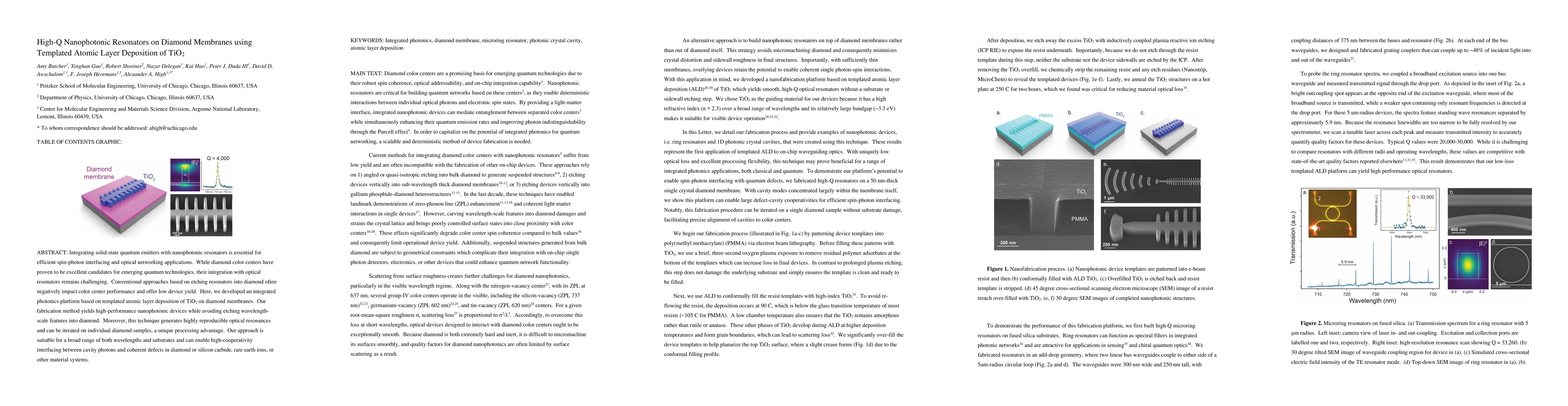 This paper presents a novel method for creating high-Q nanophotonic resonators on diamond membranes using templated atomic layer deposition of TiO2, which avoids damaging diamond color centers and offers high device yield. The method enables efficient spin-photon interfacing and optical networking applications.