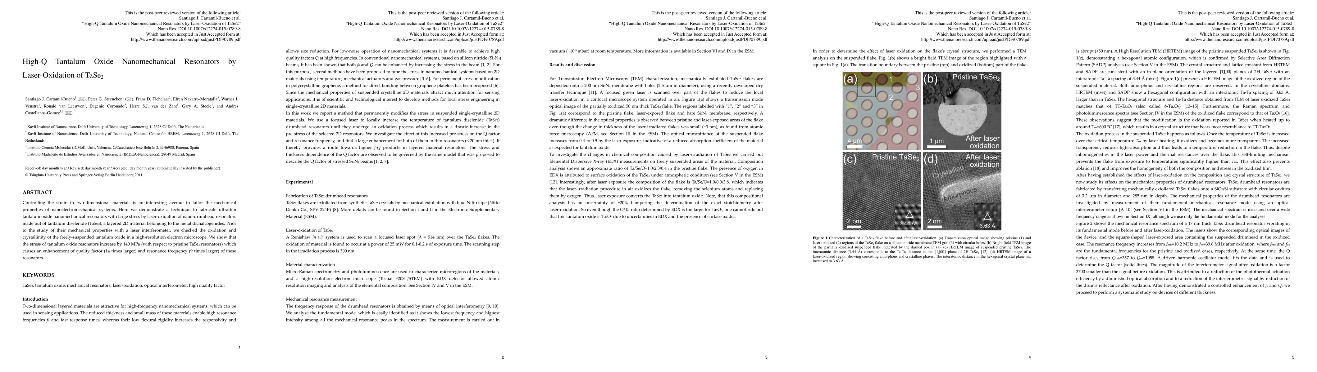This paper presents a method to fabricate ultrathin tantalum oxide nanomechanical resonators with high stress via laser-oxidation of TaSe2, achieving a 14-fold increase in quality factor and a 9-fold increase in resonance frequency due to the enhanced mechanical properties. The oxidation process and crystallinity are verified using high-resolution electron microscopy.