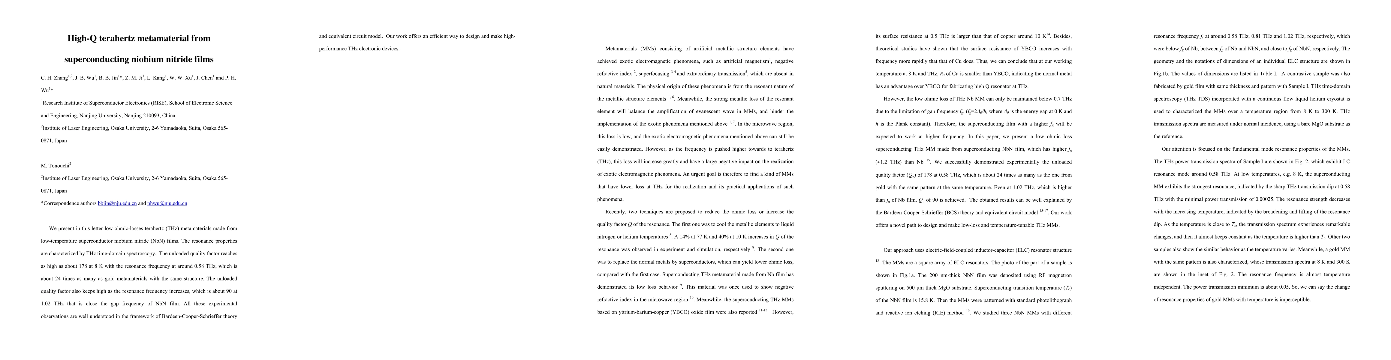 This paper reports on the development of high-Q terahertz metamaterials made from superconducting niobium nitride films, achieving an unloaded quality factor of 178 at 0.58 THz and 90 at 1.02 THz, significantly outperforming gold metamaterials. The findings are explained using Bardeen-Cooper-Schrieffer theory and an equivalent circuit model, offering a pathway for advanced THz electronic devices.
