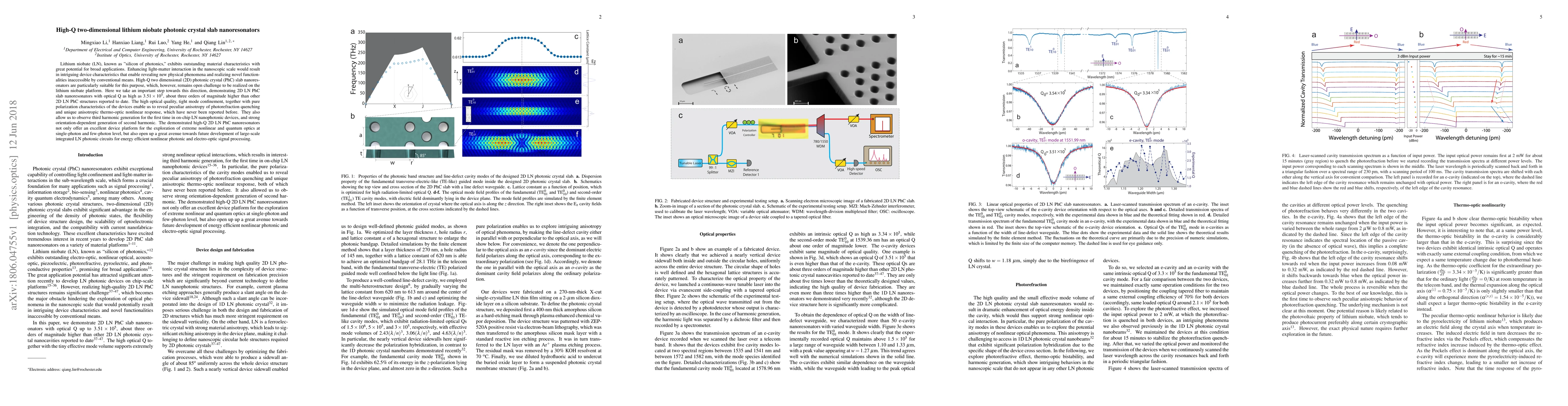 This paper demonstrates high-Q two-dimensional lithium niobate photonic crystal slab nanoresonators with an optical Q factor of $3.51 \times 10^5$, significantly enhancing light-matter interaction. The study reveals novel anisotropic photorefraction and thermo-optic nonlinear responses, and observes third harmonic generation and strong second harmonic generation for the first time in on-chip LN devices.