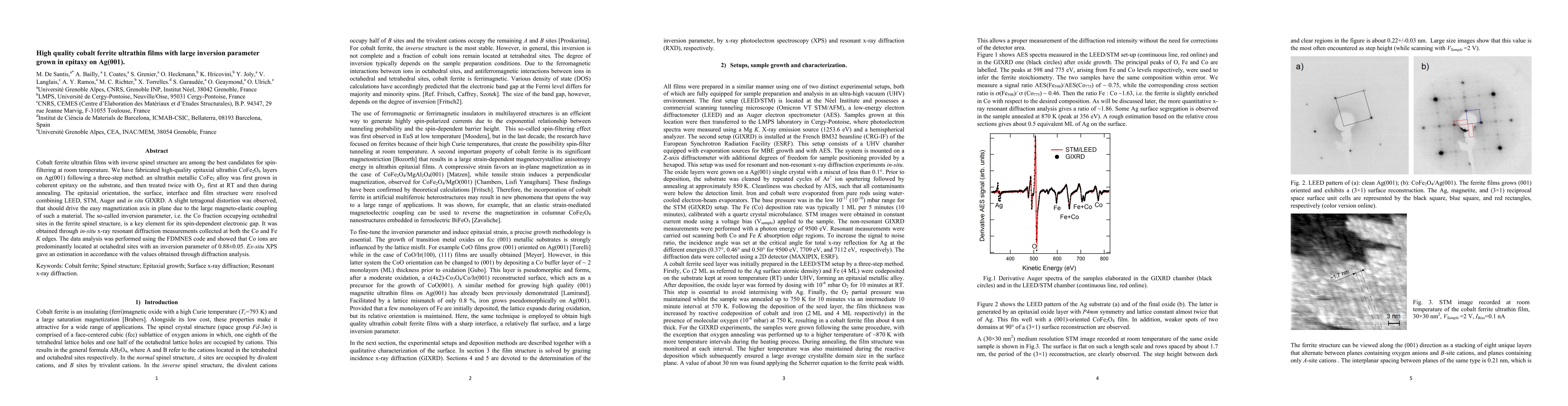 This paper reports the fabrication of high-quality epitaxial cobalt ferrite ultrathin films on Ag(001) using a three-step method, achieving a large inversion parameter of 0.88 ± 0.05, which is crucial for spin-filtering applications at room temperature. The study utilized various techniques to determine the film's structure and composition.