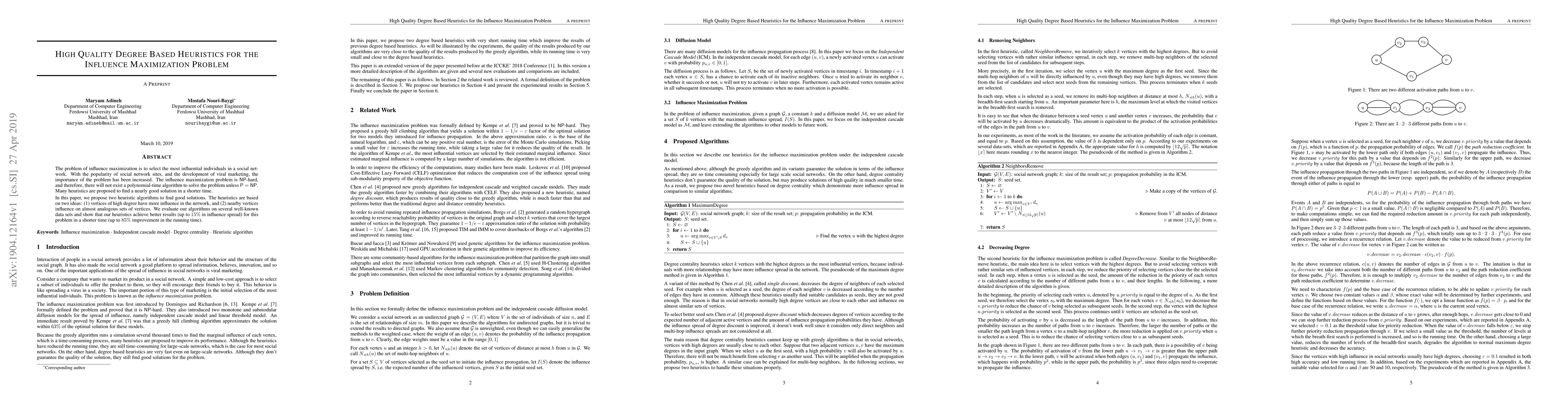 This paper proposes two heuristic algorithms for the influence maximization problem in social networks, leveraging high-degree vertices and local influence propagation. The algorithms achieve up to 15% higher influence spread and 85% faster execution compared to existing methods.