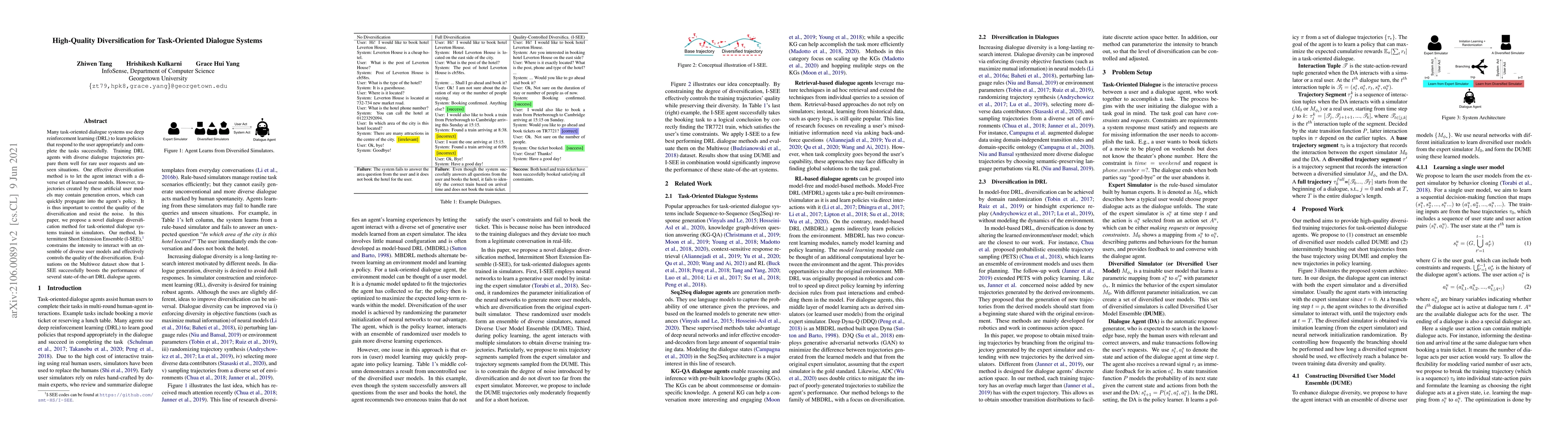 This paper proposes Intermittent Short Extension Ensemble (I-SEE), a novel method to diversify training for task-oriented dialogue systems using deep reinforcement learning. I-SEE controls the quality of diversification by limiting interactions with an ensemble of diverse user models, thereby mitigating the impact of generation errors and enhancing system performance.