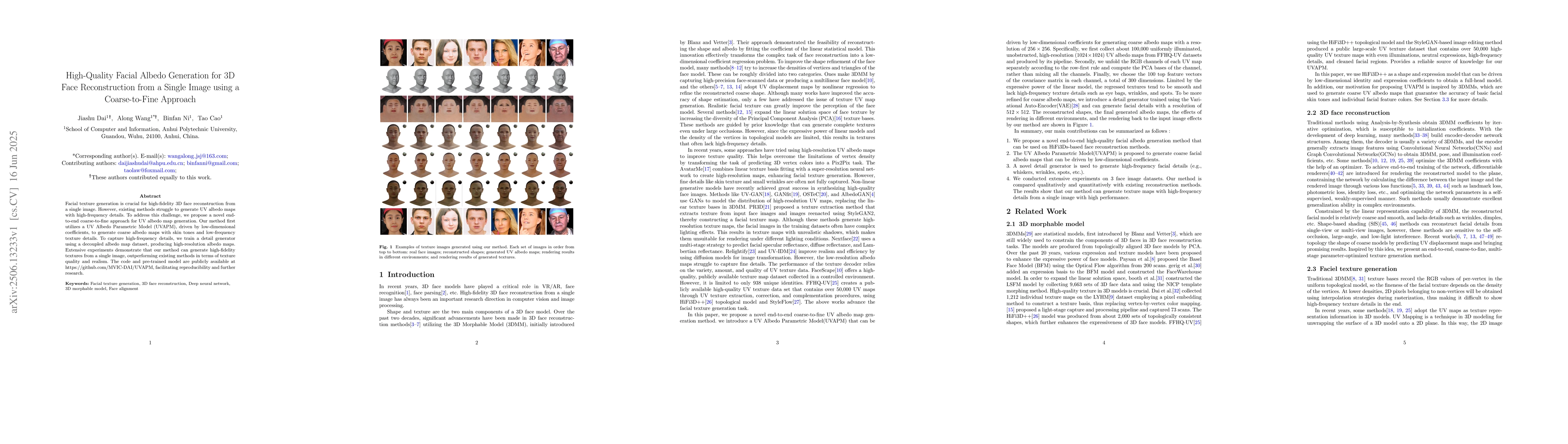 Facial texture generation is crucial for high-fidelity 3D face reconstruction from a single image. However, existing methods struggle to generate UV albedo maps with high-frequency details. To address this challenge, we propose a novel end-to-end coarse-to-fine approach for UV albedo map generation. Our method first utilizes a UV Albedo Parametric Model (UVAPM), driven by low-dimensional coefficients, to generate coarse albedo maps with skin tones and low-frequency texture details. To capture high-frequency details, we train a detail generator using a decoupled albedo map dataset, producing high-resolution albedo maps. Extensive experiments demonstrate that our method can generate high-fidelity textures from a single image, outperforming existing methods in terms of texture quality and realism. The code and pre-trained model are publicly available at https://github.com/MVIC-DAI/UVAPM, facilitating reproducibility and further research.