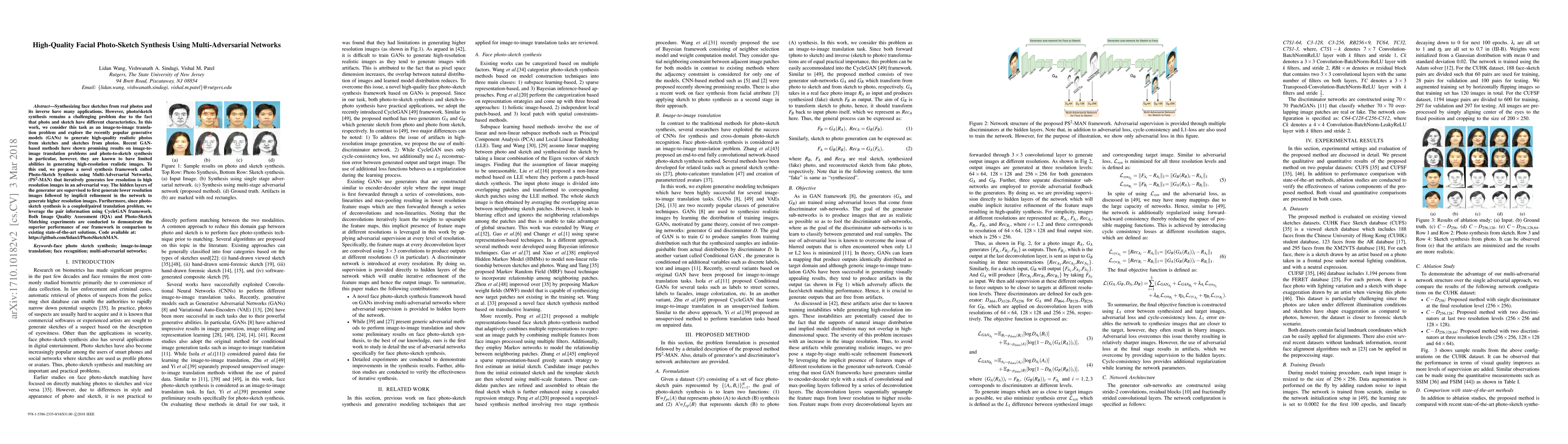 This paper proposes a novel framework called PS2-MAN for high-quality facial photo-sketch synthesis using multi-adversarial networks, which iteratively refines images from low to high resolution. The method leverages CycleGAN for paired translation and demonstrates superior performance in image quality and matching compared to existing methods.