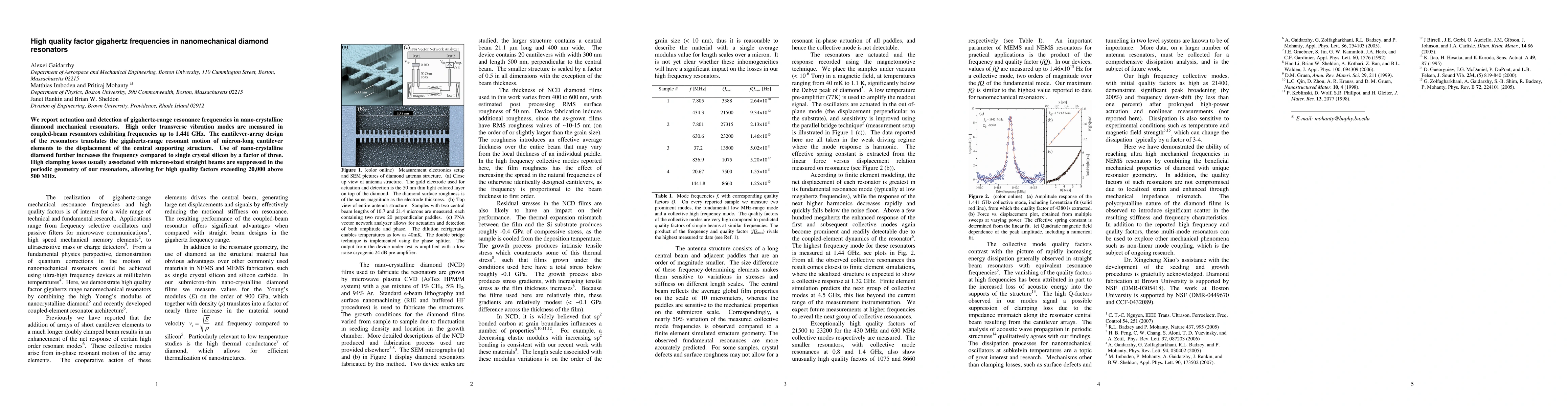 This research demonstrates the actuation and detection of gigahertz resonance frequencies in nano-crystalline diamond mechanical resonators, achieving frequencies up to 1.441 GHz with high quality factors exceeding 20,000, due to the suppression of clamping losses in their periodic cantilever-array design.