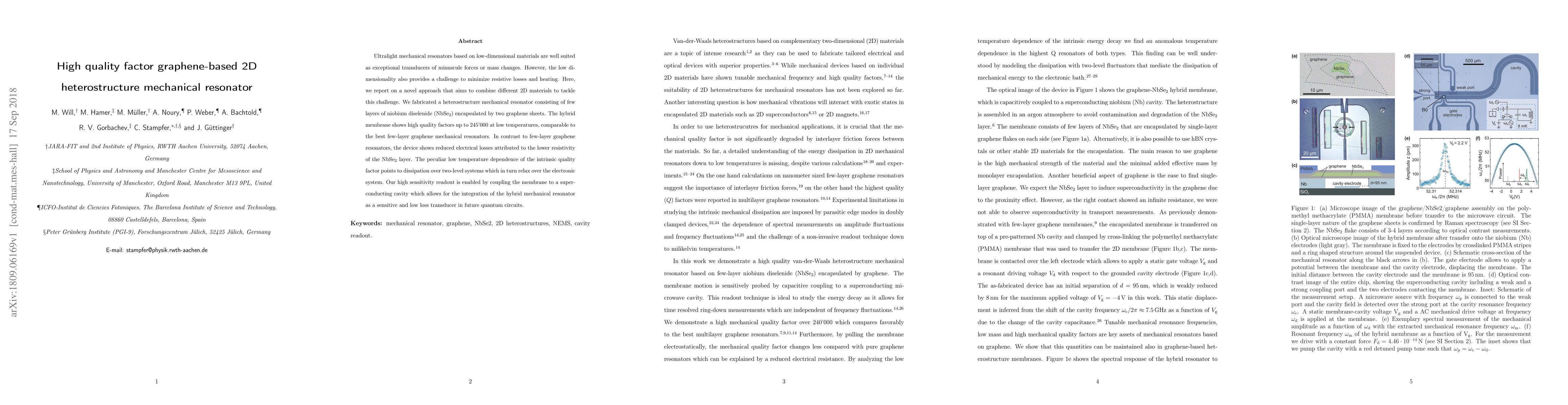 This paper reports on a novel graphene-based 2D heterostructure mechanical resonator that combines niobium diselenide with graphene to achieve high quality factors and reduced electrical losses. The hybrid resonator shows exceptional sensitivity and low loss, making it suitable for integration into future quantum circuits.