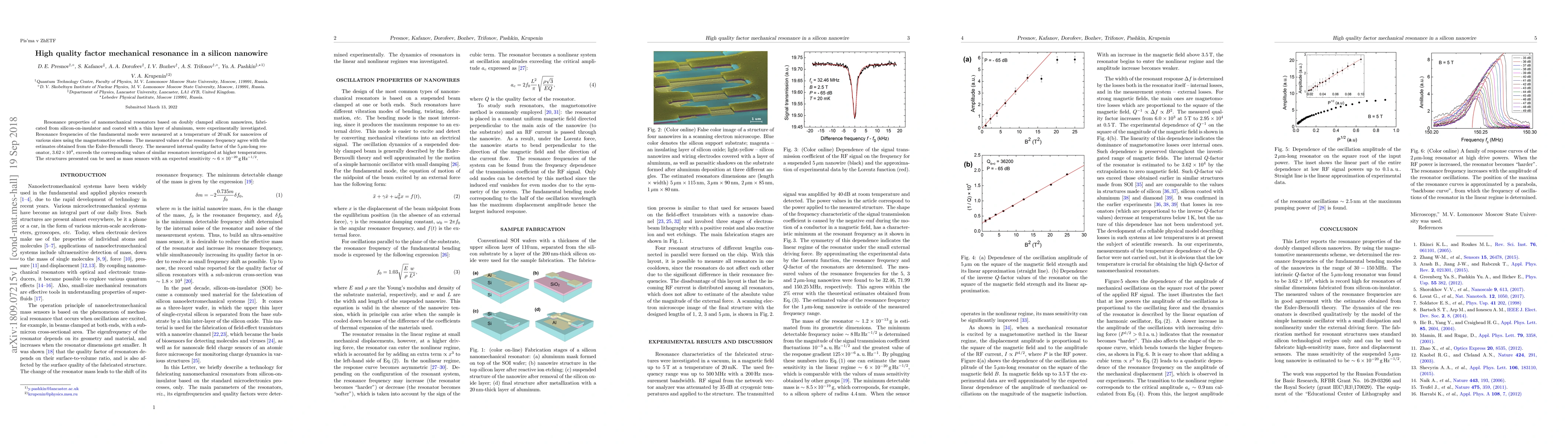 This paper investigates the resonance properties of silicon nanowire resonators, achieving high quality factors exceeding $3.62\times10^4$ at $20\,\mathrm{mK}$. The study suggests these structures could serve as highly sensitive mass sensors.
