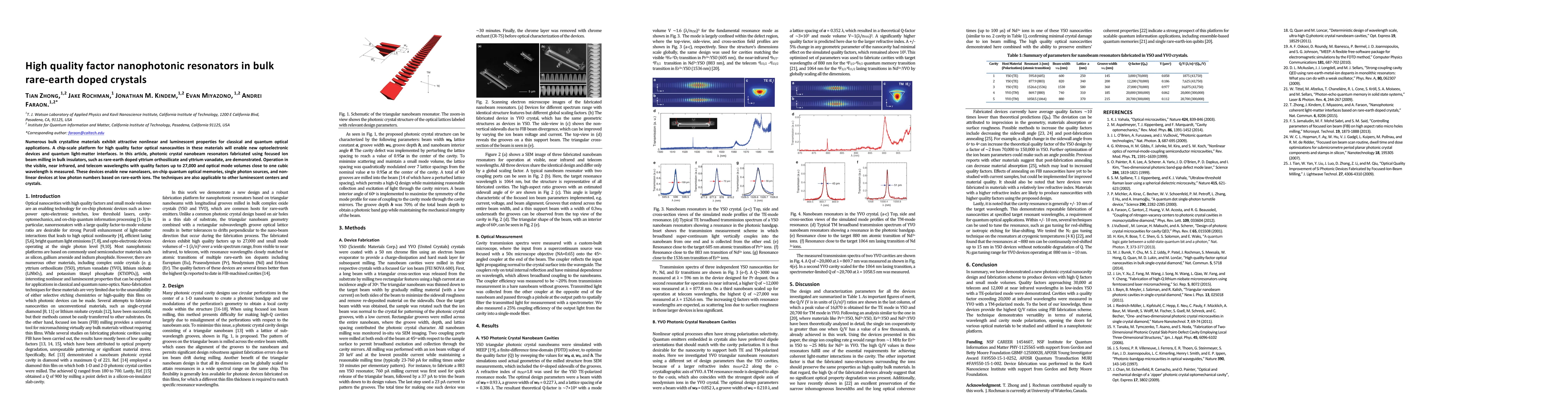 This paper demonstrates high quality factor photonic crystal nanobeam resonators in bulk rare-earth doped insulators, achieving operation across visible to telecom wavelengths with quality factors up to 27,000. These resonators enable new optoelectronic devices and quantum light-matter interfaces.