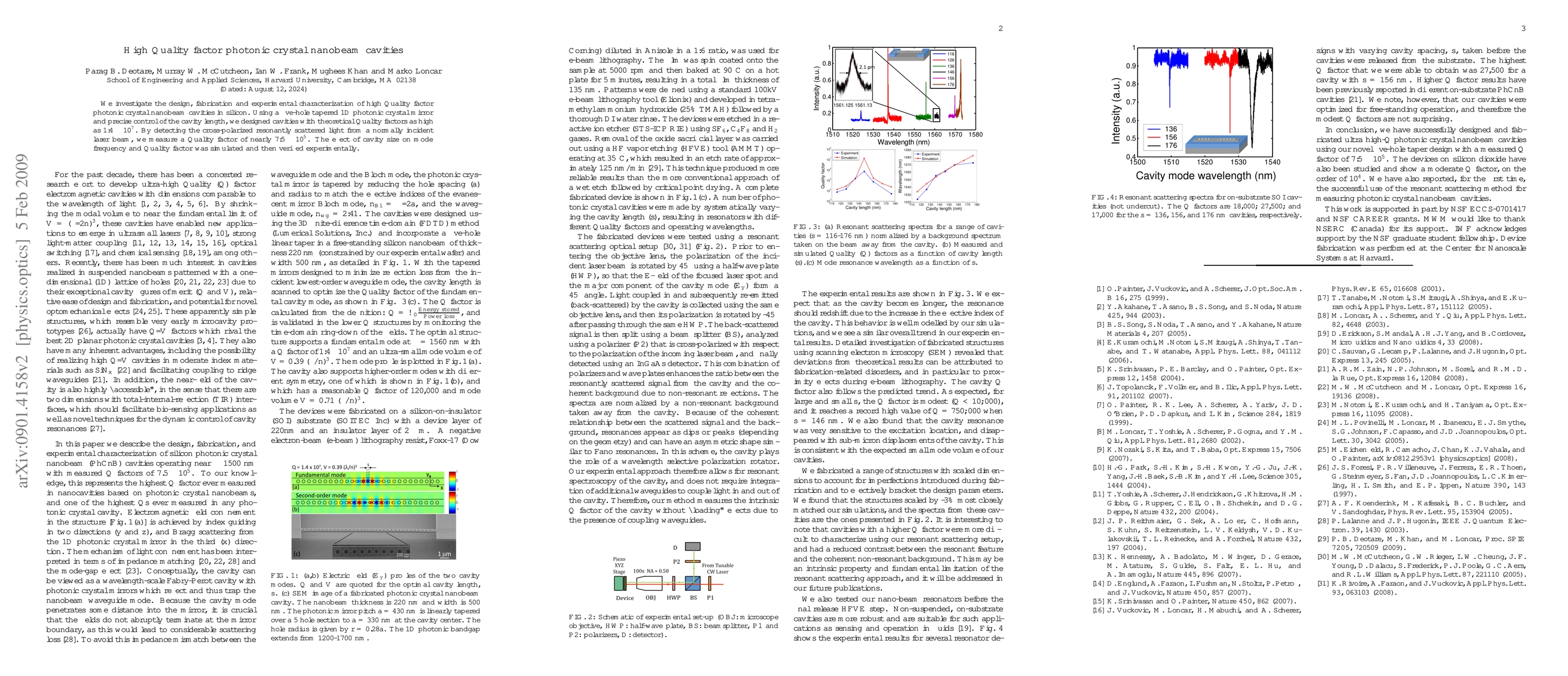 This paper details the design and fabrication of high Quality factor photonic crystal nanobeam cavities in silicon, achieving theoretical values up to 14 million. Experimental characterization measures a Quality factor of nearly 750,000, validated through simulations of cavity size effects on mode frequency.