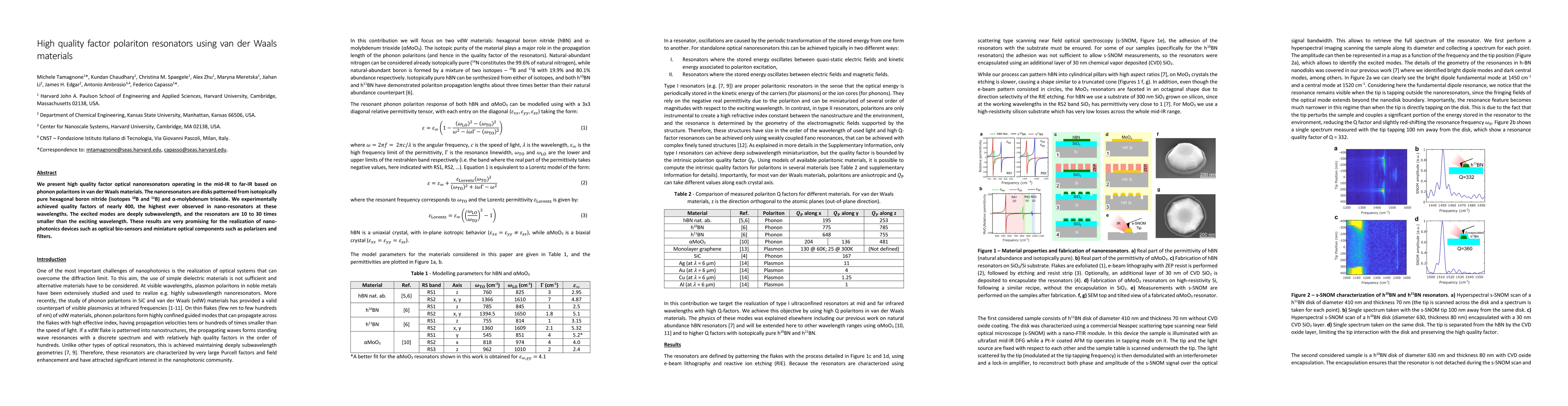 This paper demonstrates high quality factor optical nanoresonators in the mid-IR to far-IR range using phonon polaritons in van der Waals materials, achieving unprecedented quality factors of nearly 400 and subwavelength dimensions, promising for advanced nano-photonics applications.