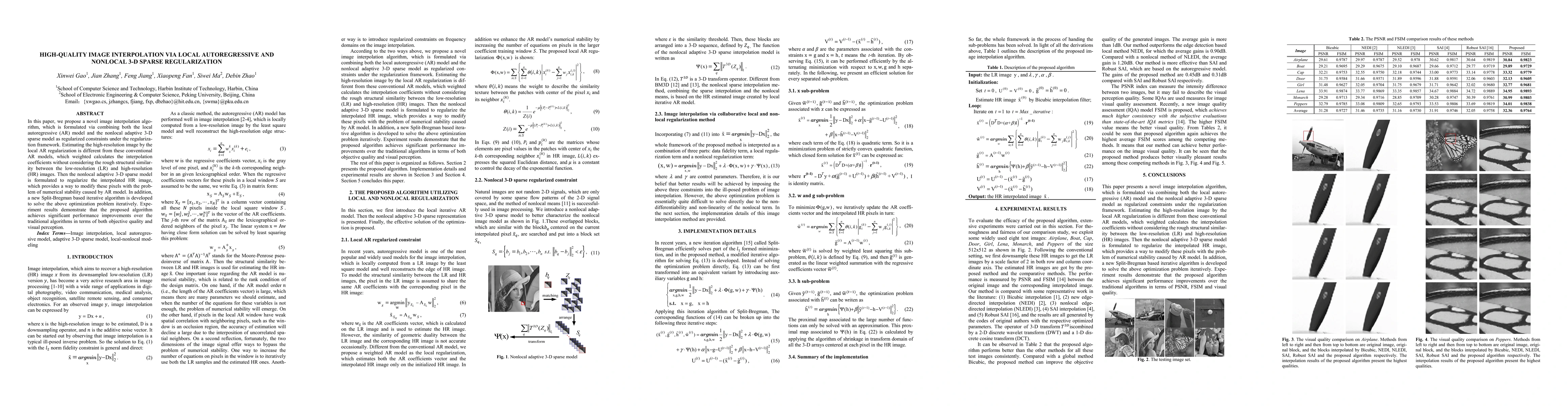 This paper proposes a new image interpolation algorithm combining local autoregressive and nonlocal 3-D sparse regularization to achieve significant performance improvements over traditional algorithms.