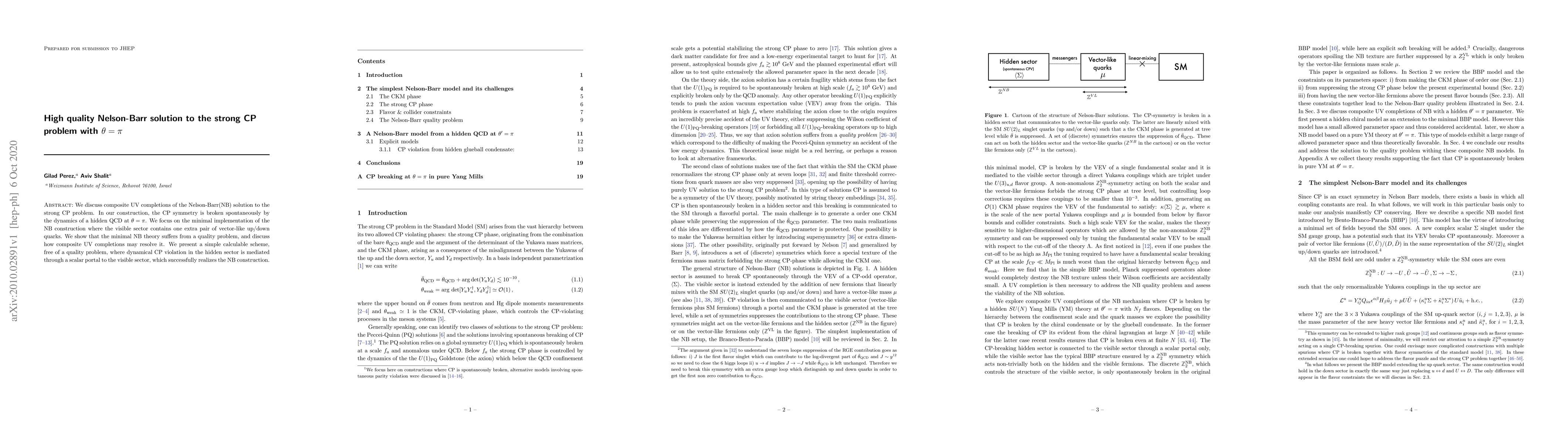This paper proposes a composite UV completion of the Nelson-Barr solution to the strong CP problem, where CP symmetry is spontaneously broken by a hidden QCD sector at $\theta=\pi$. It addresses the quality problem in the minimal NB theory with additional vector-like quarks and suggests a calculable scheme using a scalar portal to resolve it.
