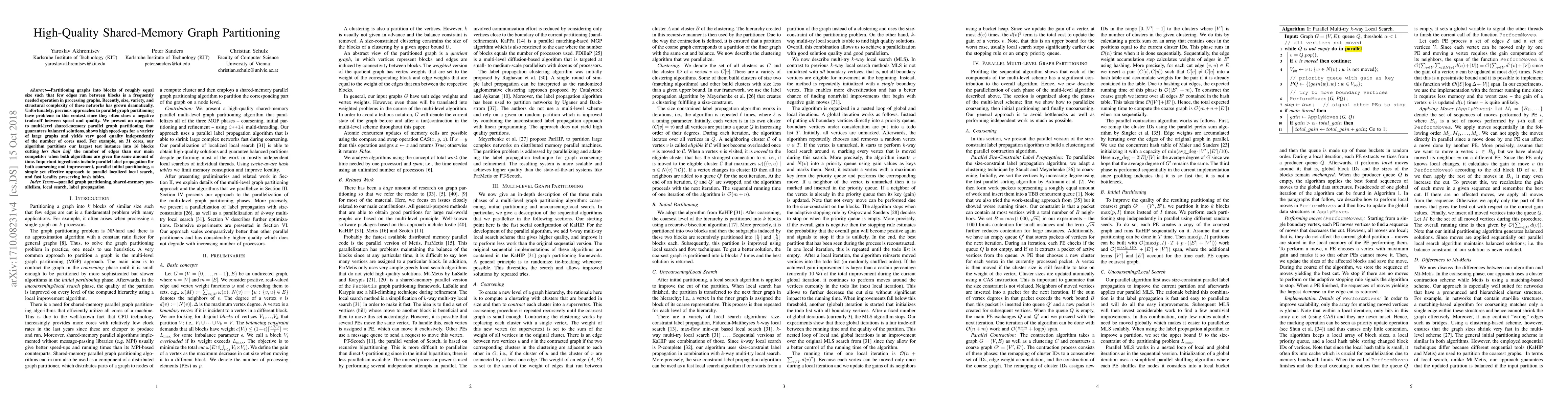 This research introduces a shared-memory parallel graph partitioning method that guarantees balanced partitions while achieving high speed-ups and excellent quality across various large graphs, regardless of the number of cores. Key techniques include parallel label propagation, efficient localized local search, and locality-preserving hash tables.