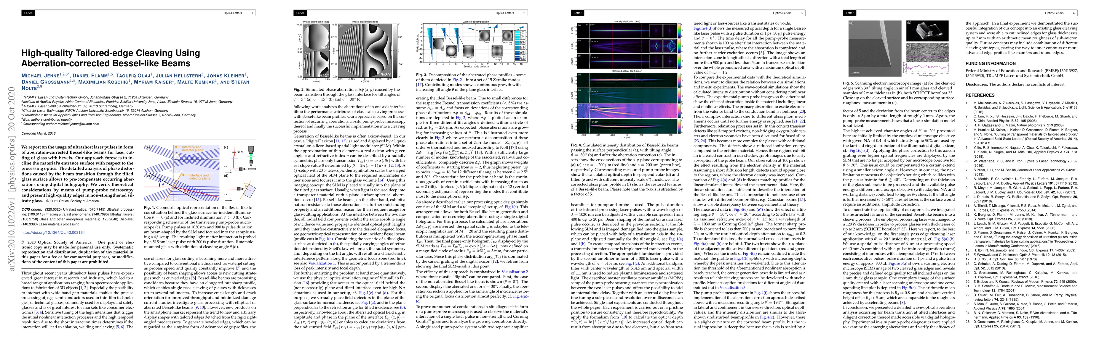 We report on the usage of ultrashort laser pulses in form of aberration-corrected Bessel-like beams for laser cutting of glass with bevels. Our approach foresees to incline the material's entrance surface with respect to the processing optics. The detailed analysis of phase distortions caused by the beam transition through the tilted glass surface allows to pre-compensate occurring aberrations using digital holography. We verify theoretical considerations by means of pump-probe microscopy and present high-quality edges in non-strengthened silicate glass.