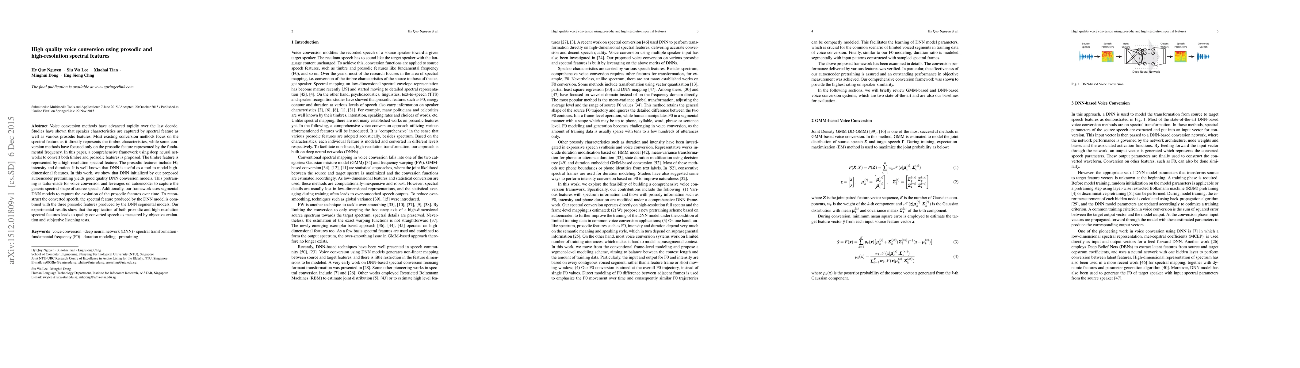 This paper proposes a deep neural network framework for high-quality voice conversion that integrates both high-resolution spectral and prosodic features, including F0, intensity, and duration. The DNN is pre-trained using an autoencoder to capture the generic spectral shape, leading to improved conversion models.