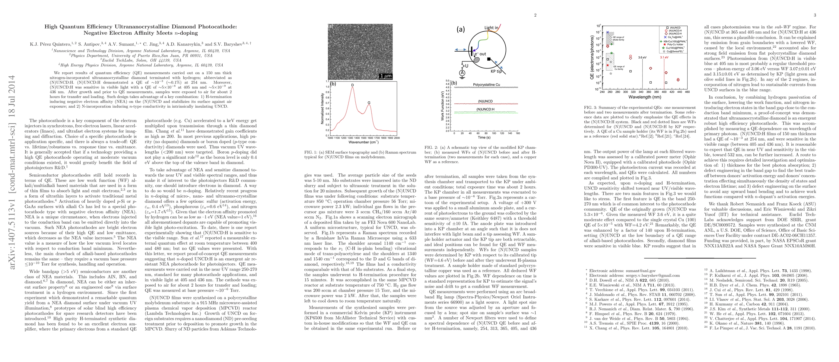 This paper reports high quantum efficiency measurements on nitrogen-incorporated ultrananocrystalline diamond photocathodes terminated with hydrogen, achieving QE up to 0.1% at 254 nm and sensitivity in visible light. The design leverages H-termination for negative electron affinity and N-doping for $n$-type conductivity.