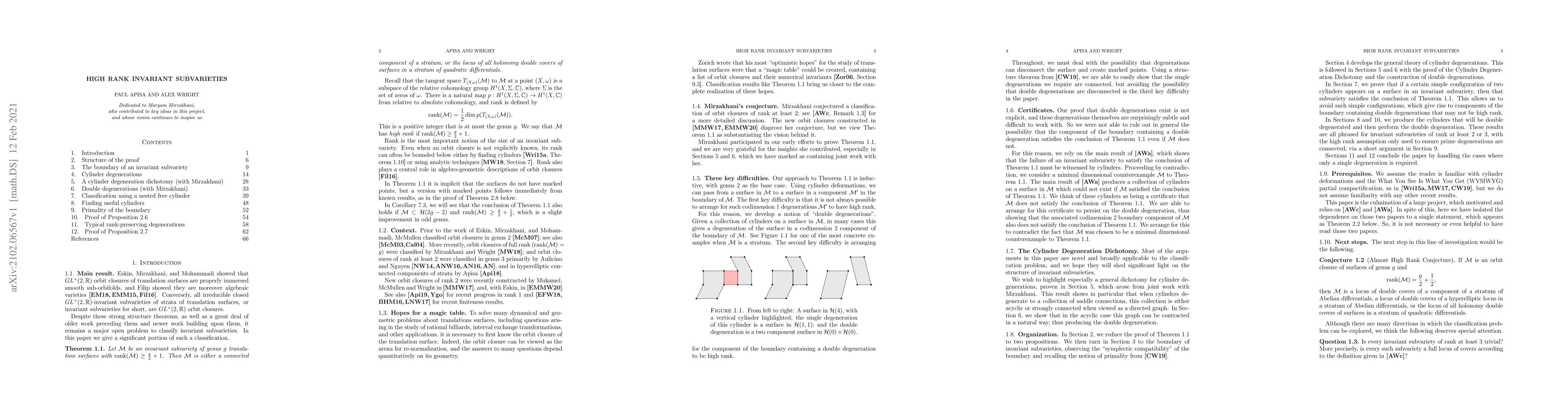 The paper introduces and proves the Cylinder Degeneration Dichotomy and the concept of double degenerations, advancing the theory of invariant subvarieties under specific group actions.