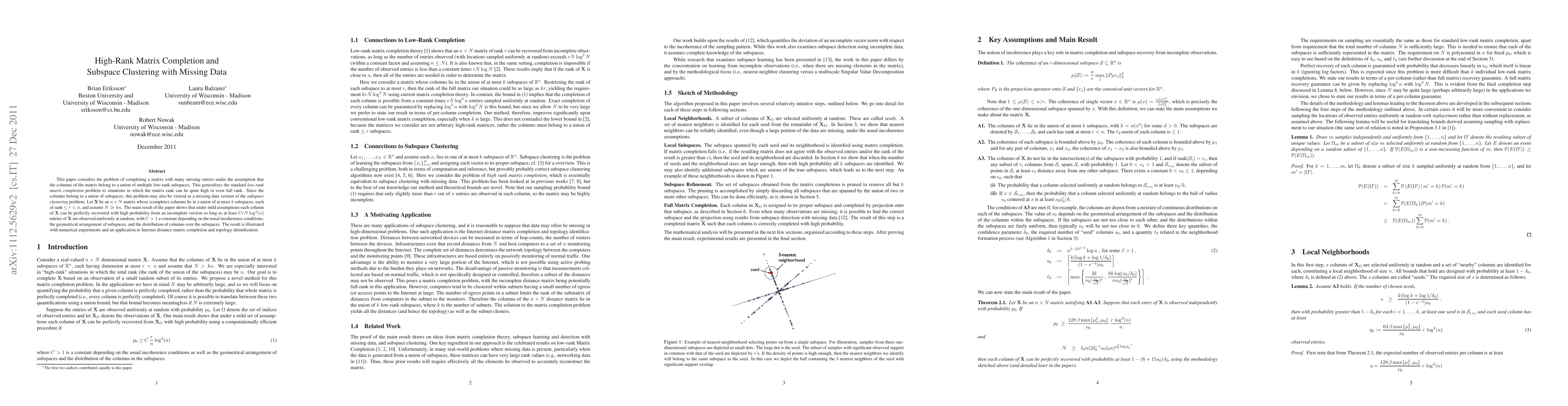 This paper addresses high-rank matrix completion and subspace clustering with missing data, showing that columns belonging to a union of low-rank subspaces can be accurately recovered from a sufficient number of observed entries, with an application to Internet distance matrix completion. Numerical experiments validate the theoretical results.