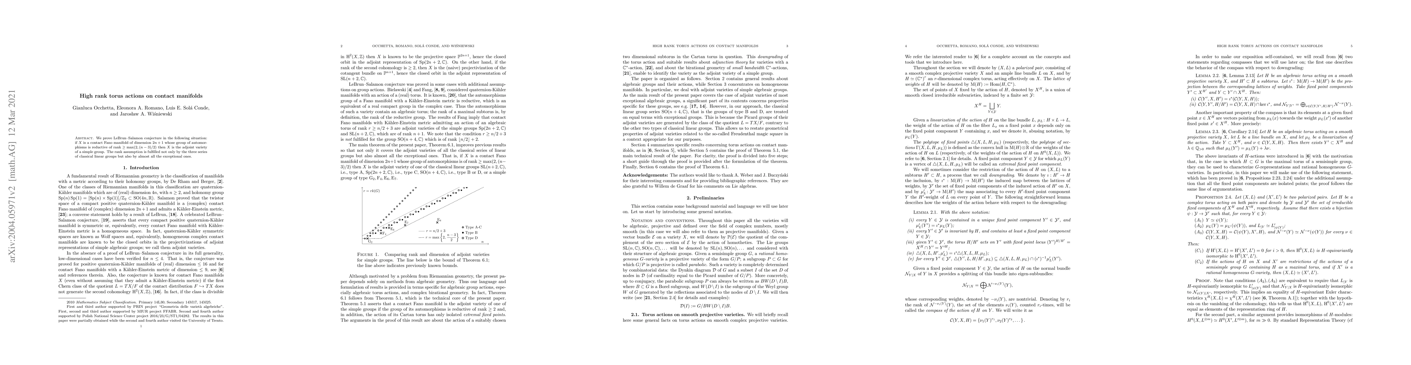 We prove LeBrun--Salamon conjecture in the following situation: if $X$ is a contact Fano manifold of dimension $2n+1$ whose group of automorphisms is reductive of rank $\geq \max(2,(n-3)/2)$ then $X$ is the adjoint variety of a simple group. The rank assumption is fulfilled not only by the three series of classical linear groups but also by almost all the exceptional ones.