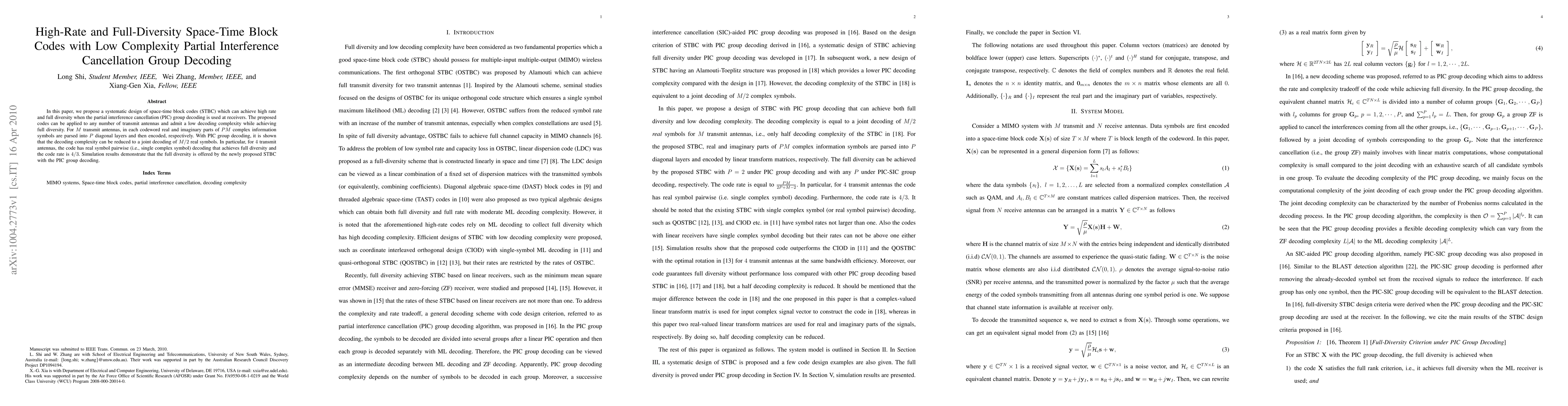This paper proposes a design for space-time block codes (STBC) that achieve high rate and full diversity using partial interference cancellation group decoding. The method reduces decoding complexity and is applicable to any number of transmit antennas.