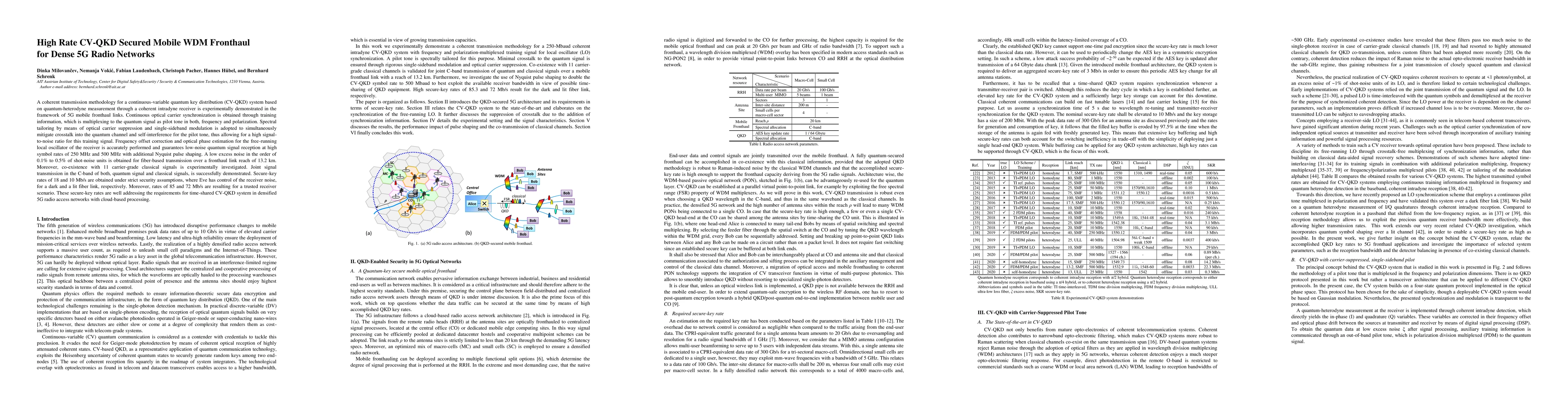 This paper demonstrates a high-rate CV-QKD system for secure mobile fronthaul links in dense 5G networks using coherent intradyne reception. The system achieves secure-key rates of 18 and 10 Mb/s under various noise conditions, addressing the security needs for time-shared CV-QKD in 5G radio access networks.