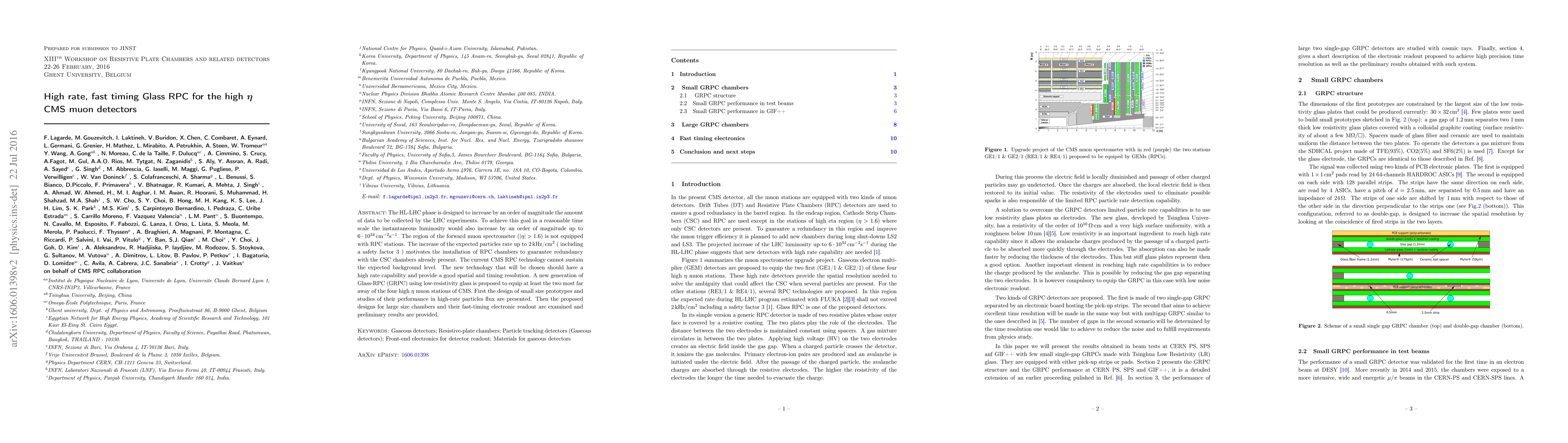 The HL-LHC phase is designed to increase by an order of magnitude the amount of data to be collected by the LHC experiments. To achieve this goal in a reasonable time scale the instantaneous luminosity would also increase by an order of magnitude up to $6.10^{34} cm^{-2} s^{-1}$ . The region of the forward muon spectrometer ($|{\eta}| > 1.6$) is not equipped with RPC stations. The increase of the expected particles rate up to $2 kHz/cm^{2}$ (including a safety factor 3) motivates the installation of RPC chambers to guarantee redundancy with the CSC chambers already present. The actual RPC technology of CMS cannot sustain the expected background level. The new technology that will be chosen should have a high rate capability and provides a good spatial and timing resolution. A new generation of Glass-RPC (GRPC) using low-resistivity (LR) glass is proposed to equip at least the two most far away of the four high ${\eta}$ muon stations of CMS. First the design of small size prototypes and studies of their performance in high-rate particles flux is presented. Then the proposed designs for large size chambers and their fast-timing electronic readout are examined and preliminary results are provided.
