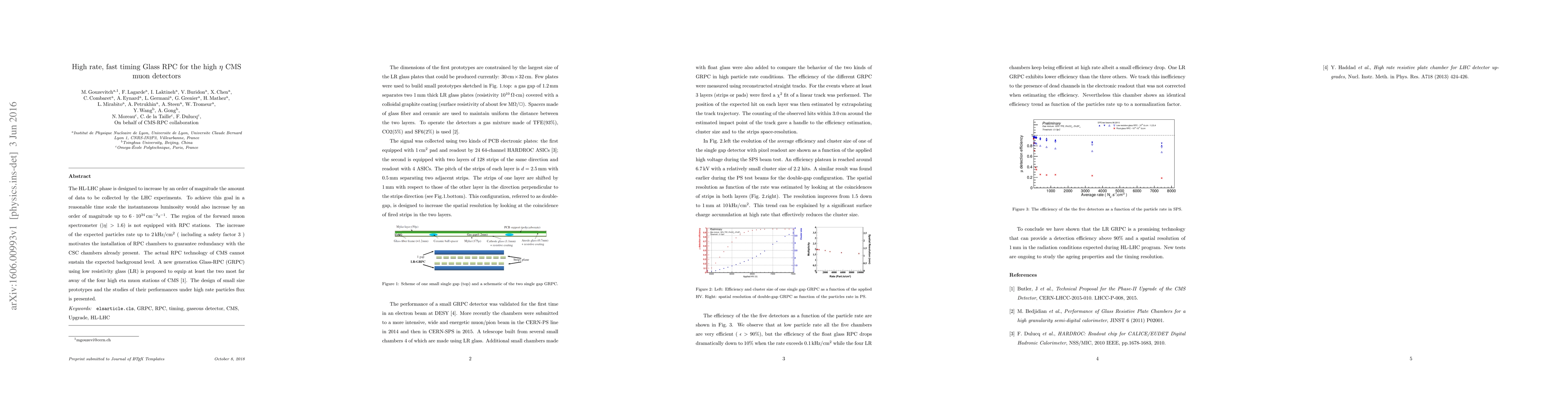 The HL-LHC phase is designed to increase by an order of magnitude the amount of data to be collected by the LHC experiments. To achieve this goal in a reasonable time scale the instantaneous luminosity would also increase by an order of magnitude up to $6 \cdot 10^{34}$ cm$^{-2}$s$^{-1}$. The region of the forward muon spectrometer ($|\eta| > 1.6$) is not equipped with RPC stations. The increase of the expected particles rate up to 2 kHz/cm$^2$ ( including a safety factor 3 ) motivates the installation of RPC chambers to guarantee redundancy with the CSC chambers already present. The actual RPC technology of CMS cannot sustain the expected background level. A new generation Glass-RPC (GRPC) using low resistivity glass (LR) is proposed to equip at least the two most far away of the four high eta muon stations of CMS. The design of small size prototypes and the studies of their performances under high rate particles flux is presented.