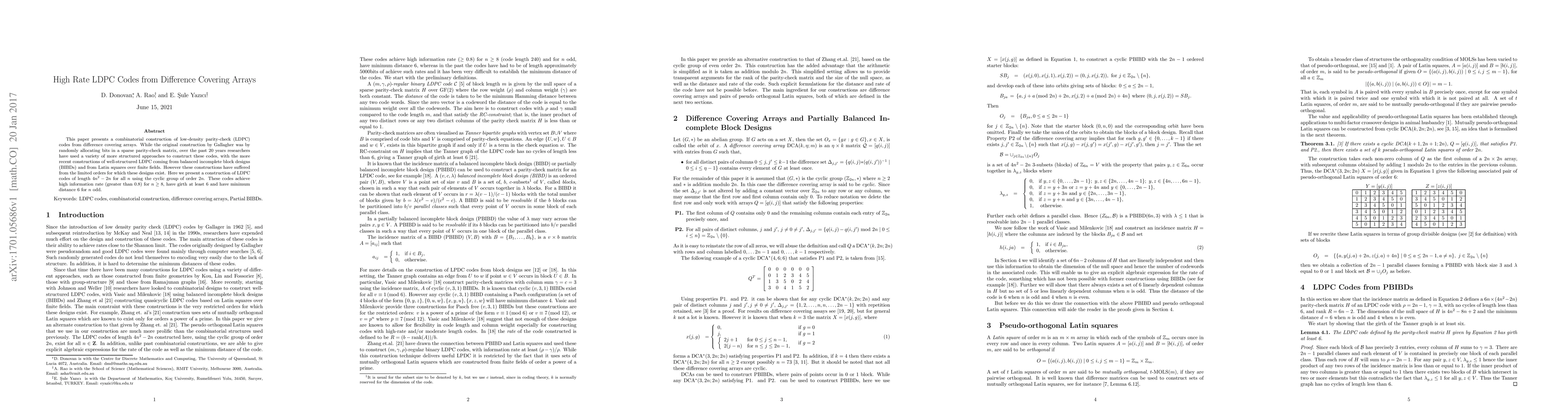 This paper introduces a combinatorial method to construct high-rate LDPC codes using difference covering arrays, achieving a rate greater than 0.8 for $n \geq 8$ and a girth of at least 6, while addressing limitations of previous designs based on BIBDs and Latin squares.