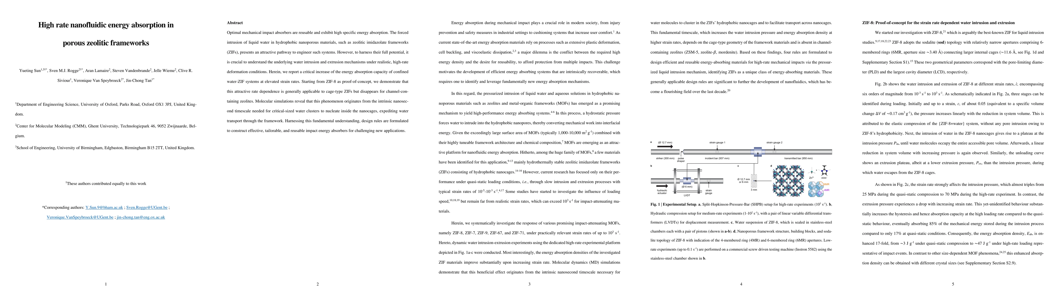 This study investigates the high-rate energy absorption capacity of zeolitic imidazolate frameworks (ZIFs) when infused with liquid water, revealing a significant rate-dependent increase in absorption due to rapid water cluster nucleation within nanocages. Design principles are derived for creating efficient, reusable impact absorbers based on these findings.