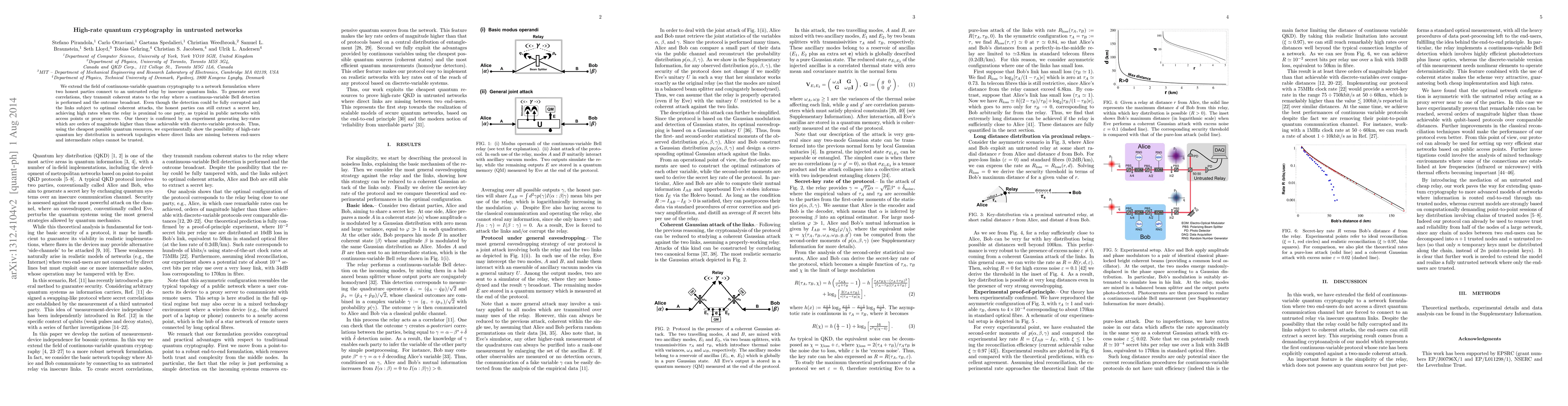 We extend the field of continuous-variable quantum cryptography to a network formulation where two honest parties connect to an untrusted relay by insecure quantum links. To generate secret correlations, they transmit coherent states to the relay where a continuous-variable Bell detection is performed and the outcome broadcast. Even though the detection could be fully corrupted and the links subject to optimal coherent attacks, the honest parties can still extract a secret key, achieving high rates when the relay is proximal to one party, as typical in public networks with access points or proxy servers. Our theory is confirmed by an experiment generating key-rates which are orders of magnitude higher than those achievable with discrete-variable protocols. Thus, using the cheapest possible quantum resources, we experimentally show the possibility of high-rate quantum key distribution in network topologies where direct links are missing between end-users and intermediate relays cannot be trusted.