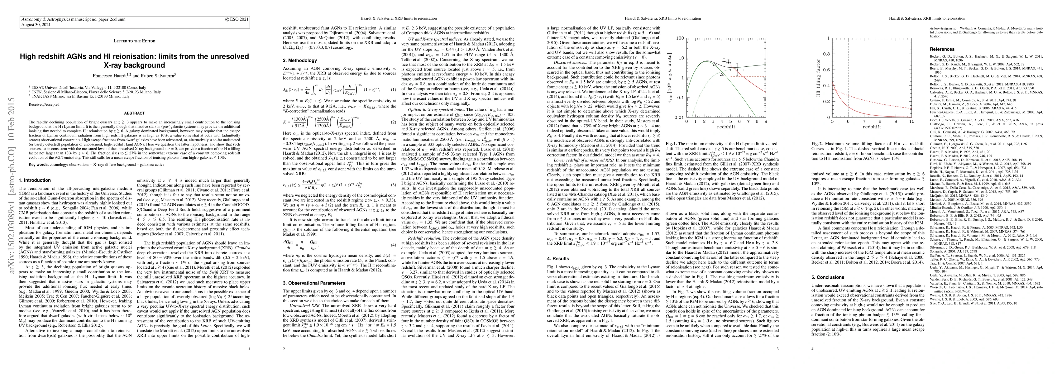 The rapidly declining population of bright quasars at z~3 appears to make an increasingly small contribution to the ionising background at the HI Lyman limit. It is then generally though that massive stars in (pre-)galactic systems may provide the additional ionising flux needed to complete HI reionisation by z>6. A galaxy dominated background, however, may require that the escape fraction of Lyman continuum radiation from high redshift galaxies is as high as 10%, a value somewhat at odds with (admittedly scarce) observational constraints. High escape fractions from dwarf galaxies have been advocated, or, alternatively, a so-far undetected (or barely detected) population of unobscured, high-redshift faint AGNs. Here we question the latter hypothesis, and show that such sources, to be consistent with the measured level of the unresolved X-ray background at z=0, can provide a fraction of the HII filling factor not larger than 13% by z=6. The fraction rises to <27% in the somewhat extreme case of a constant comoving redshift evolution of the AGN emissivity. This still calls for a mean escape fraction of ionising photons from high-z galaxies >10%.