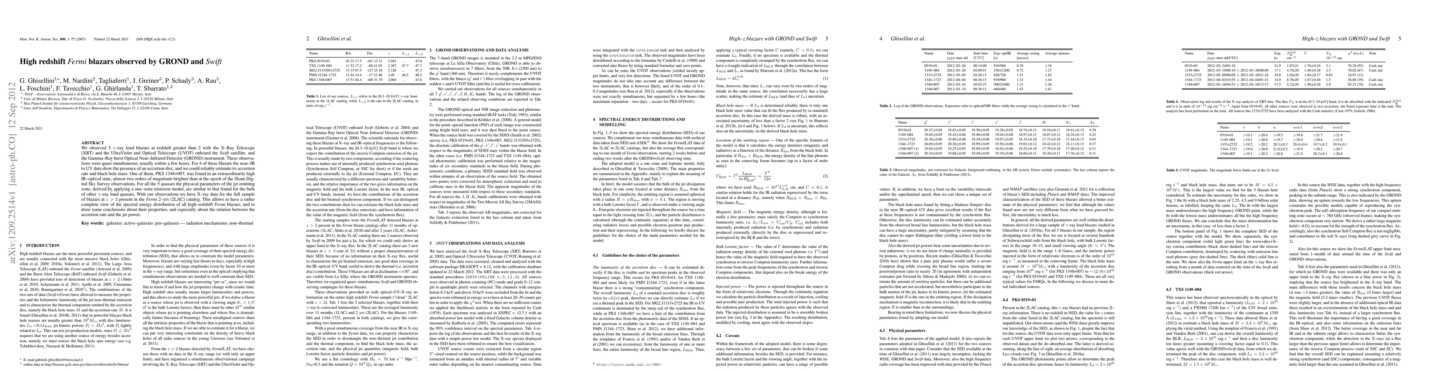 We observed 5 gamma-ray loud blazars at redshift greater than 2 with the X-Ray Telescope (XRT) and the UltraViolet and Optical Telescope (UVOT) onboard the Swift satellite, and the Gamma-Ray burst Optical Near-Infrared Detector (GROND) instrument. These observations were quasi simultaneous, usually within a few hours. For 4 of these blazars the near-IR to UV data show the presence of an accretion disc, and we could reliably estimate its accretion rate and black hole mass. One of them, PKS 1348+007, was found in an extraordinarily high IR-optical state, almost two orders of magnitude brighter than at the epoch of the Sloan Digital Sky Survey observations. For all the 5 quasars the physical parameters of the jet emitting zone, derived by applying a one-zone emission model, are similar to that found for the bulk of other gamma-ray loud quasars. With our observations we have X-ray data for the full sample of blazars at z>2 present in the Fermi 2-yrs (2LAC) catalog. This allows to have a rather complete view of the spectral energy distribution of all high-redshift Fermi blazars, and to draw some conclusions about their properties, and especially about the relation between the accretion rate and the jet power.