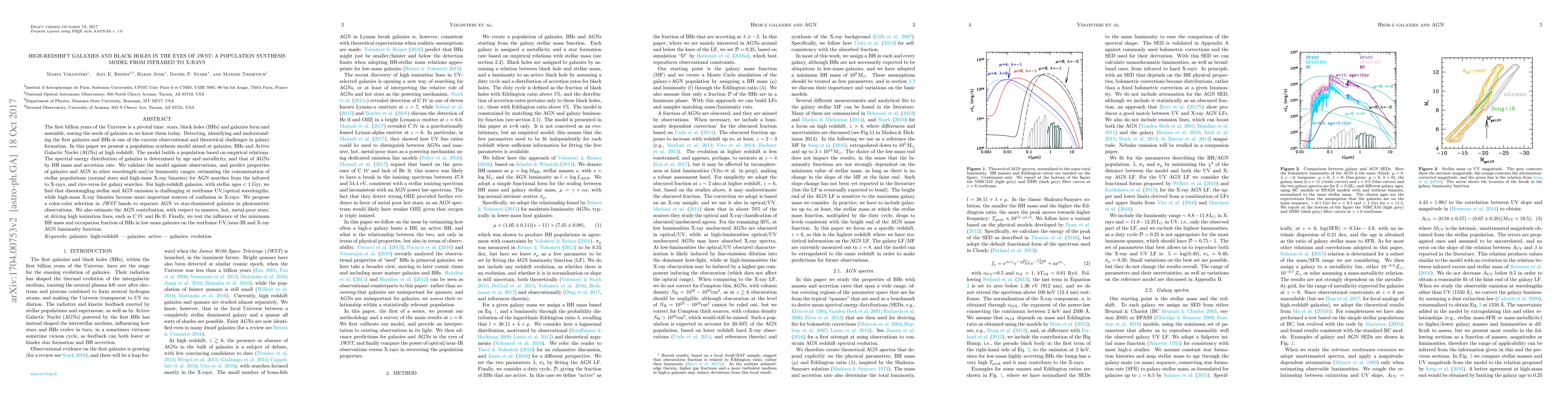This paper presents a population synthesis model for high-redshift galaxies and black holes, validated against observational data, to predict their properties across various wavelengths. It proposes a color-color selection method using JWST bands to distinguish AGNs from star-dominated galaxies, highlighting the challenges in disentangling stellar and AGN emissions in different wavelengths.