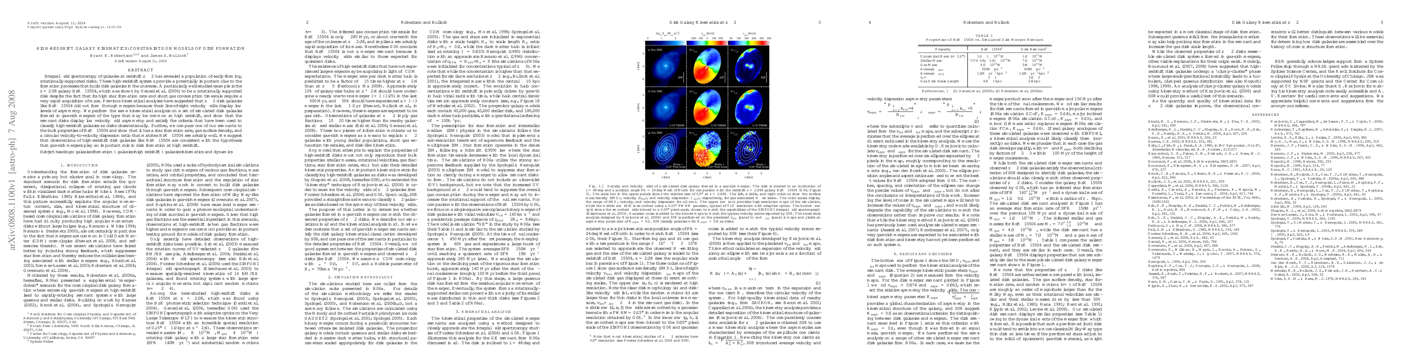 This paper uses integral field spectroscopy to analyze high-redshift galaxies, revealing that rotationally-supported disks like BzK-15504 likely formed through gas-rich mergers rather than mergers, as their velocity fields show low asymmetry. The study suggests that gas-rich mergers may be crucial for disk formation at high redshifts.