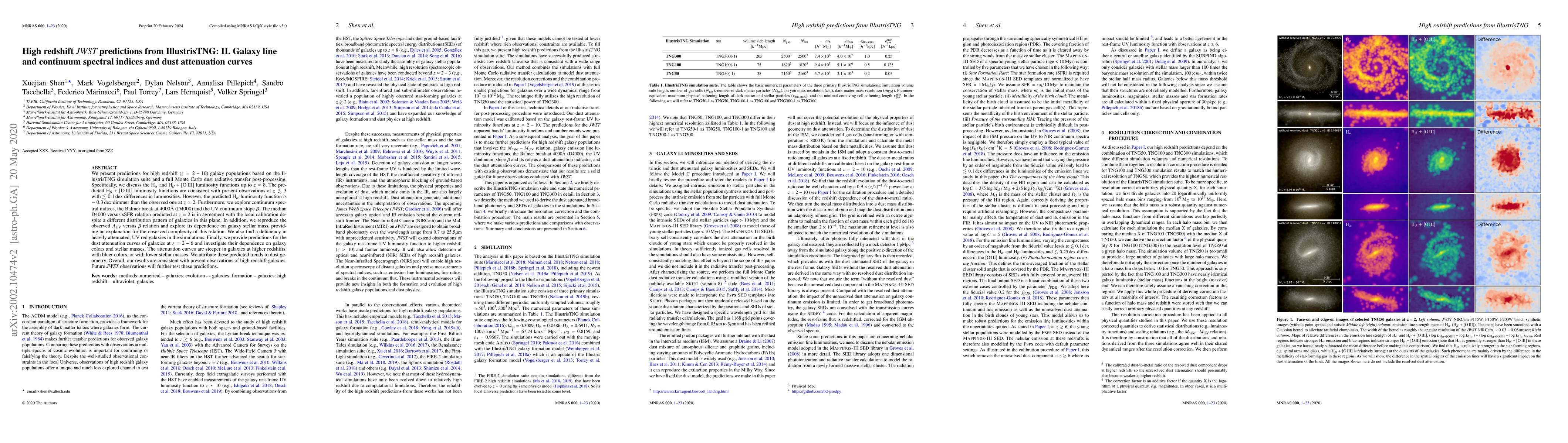 This paper uses the IllustrisTNG simulation to predict high redshift ($z=2-10$) galaxy populations and spectral indices, finding that the predicted ${\rm H}_{\alpha}$ luminosity function is dimmer than observed at $z\simeq 2$. It also explores the D4000 and UV continuum slope $\beta$ relations, and provides dust attenuation curve predictions, attributing steeper curves to higher redshifts, bluer colors, or lower stellar masses.