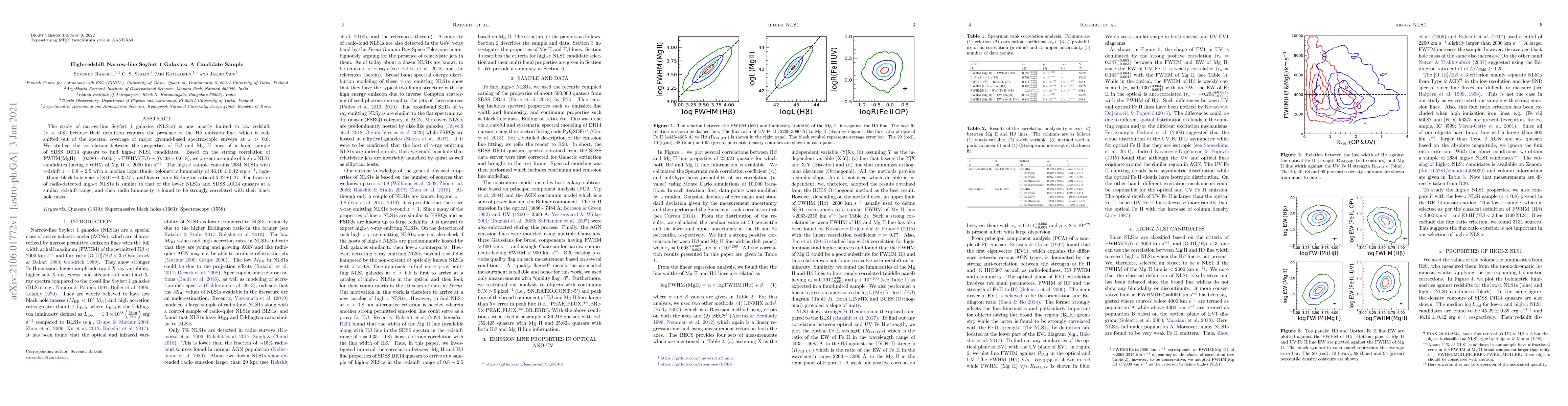 The study of narrow-line Seyfert 1 galaxies (NLS1s) is now mostly limited to low redshift ($z<0.8$) because their definition requires the presence of the H$\beta$ emission line, which is redshifted out of the spectral coverage of major ground-based spectroscopic surveys at $z>0.8$. We studied the correlation between the properties of H$\beta$ and Mg II lines of a large sample of SDSS DR14 quasars to find high-$z$ NLS1 candidates. Based on the strong correlation of $\mathrm{FWHM(MgII)=(0.880\pm 0.005) \times FWHM(H\beta)+ (0.438\pm0.018)}$, we present a sample of high-$z$ NLS1 candidates having FWHM of Mg II $<$ 2000 km s$^{-1}$. The high-$z$ sample contains 2684 NLS1s with redshift $z=0.8-2.5$ with a median logarithmic bolometric luminosity of $46.16\pm0.42$ erg s$^{-1}$, logarithmic black hole mass of $8.01\pm0.35 M_{\odot}$, and logarithmic Eddington ratio of $0.02\pm0.27$. The fraction of radio-detected high-$z$ NLS1s is similar to that of the low-$z$ NLS1s and SDSS DR14 quasars at a similar redshift range, and their radio luminosity is found to be strongly correlated with their black hole mass.