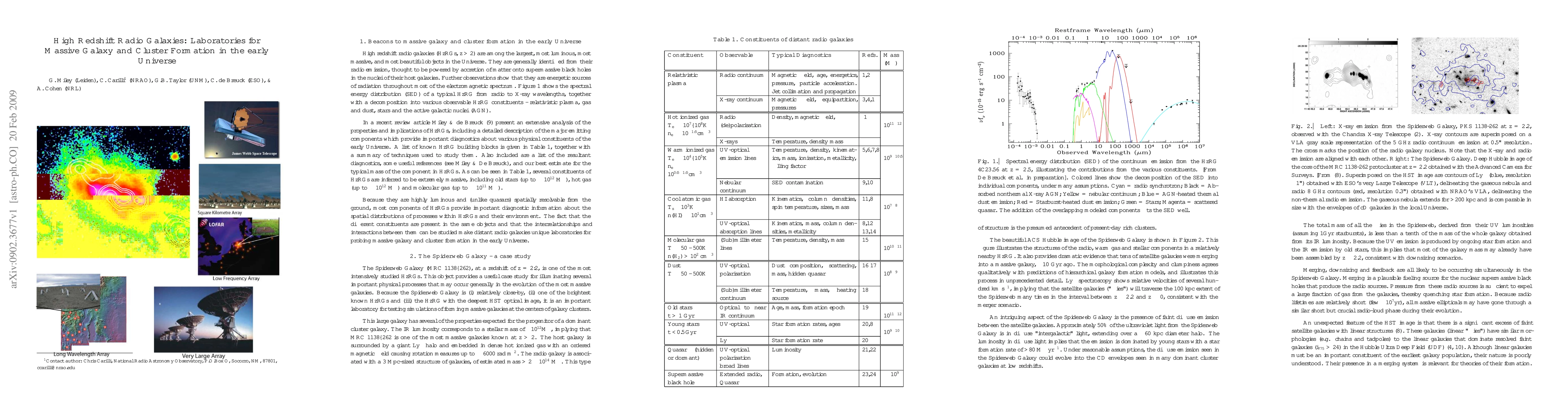 High redshift radio galaxies are among the largest, most luminous, most massive, and most beautiful objects in the Universe. They are generally identified from their radio emission, thought to be powered by accretion of matter onto supermassive black holes in the nuclei of their host galaxies. Observations show that they are energetic sources of radiation throughout most of the electromagnetic spectrum, including relativistic plasma, gas and dust, stars and the active galactic nuclei (AGN). 1 HzRGs are inferred to be extremely massive, including old stars (up to $\sim$ 10$^{12}$ M$_{\odot}$), hot gas (up to $\sim$ 10$^{12}$ M$_{\odot}$) and molecular gas (up to $\sim$ 10$^{11}$ M$_{\odot}$).Because they are highly luminous and (unlike quasars) spatially resolvable from the ground, most components of HzRGs provide important diagnostic information about the spatial distributions of processes within HzRGs and their environment. The fact that the different constituents are present in the same objects and that the {\bf {\it interrelationships and interactions between them}} can be studied make distant radio galaxies unique laboratories for probing massive galaxy and cluster formation in the early Universe.